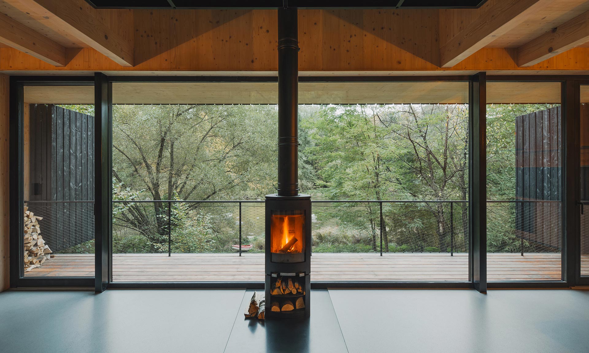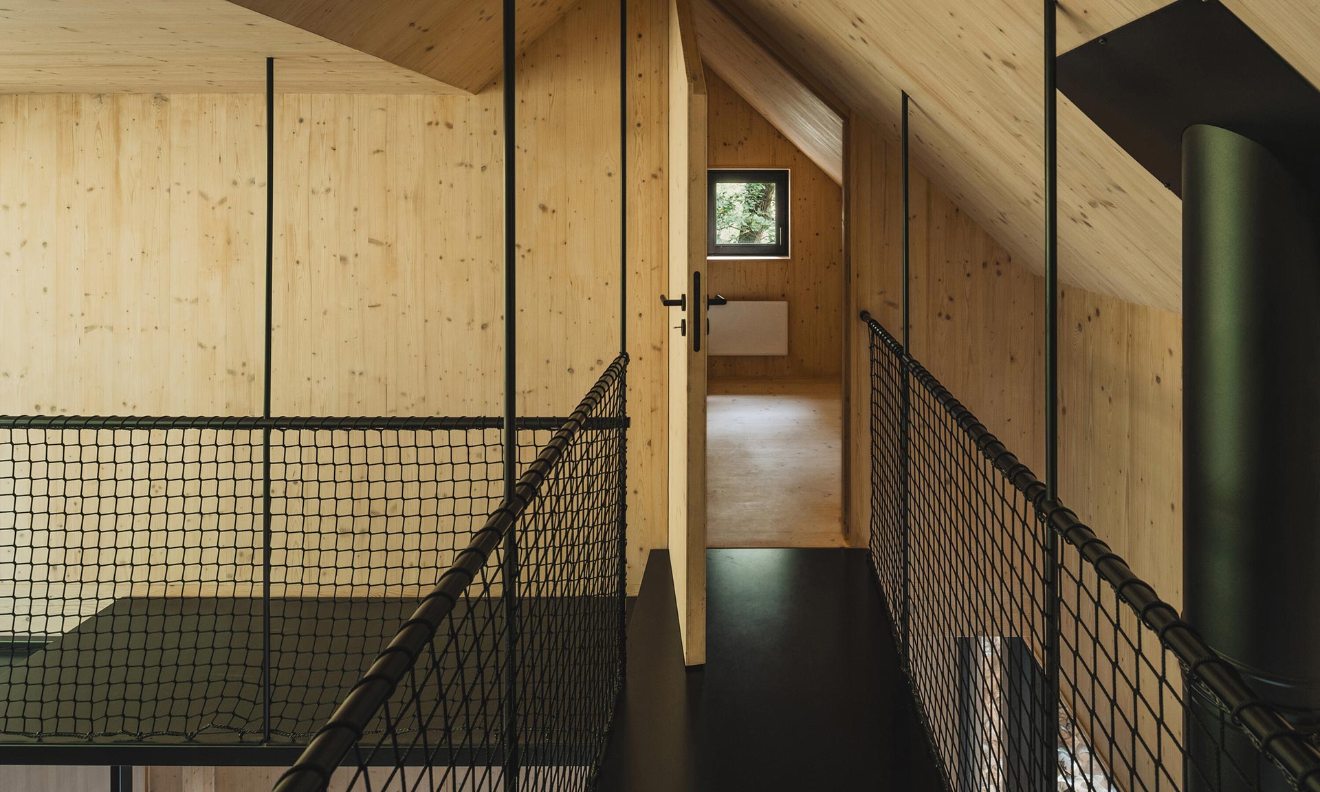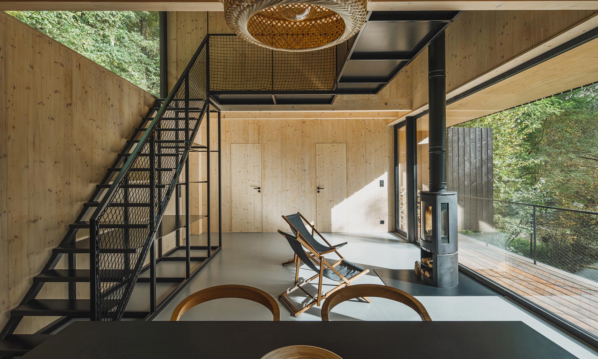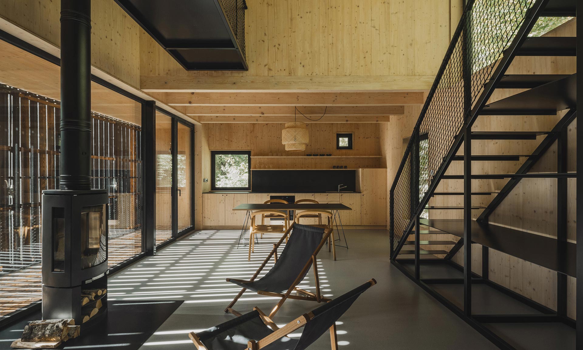 Celková užitná plocha dvoupodlažní chaty je dostatečných 78 metrů čtverečních. Hlavní dominantou zůstává výhled, který není z interiéru ničím jiným rušen než krbovými kamny. Skvělá je nadčasová kombinace černé a dřeva. Dobře zvolené jsou výplety zábradlí, dveře bez zárubní a přiměřený kusový nábytek. Jediným trnem v oku je výběr proutěného svítidla nad jídelním stolem, které by si zasloužilo mnohem neokoukanější volbu.