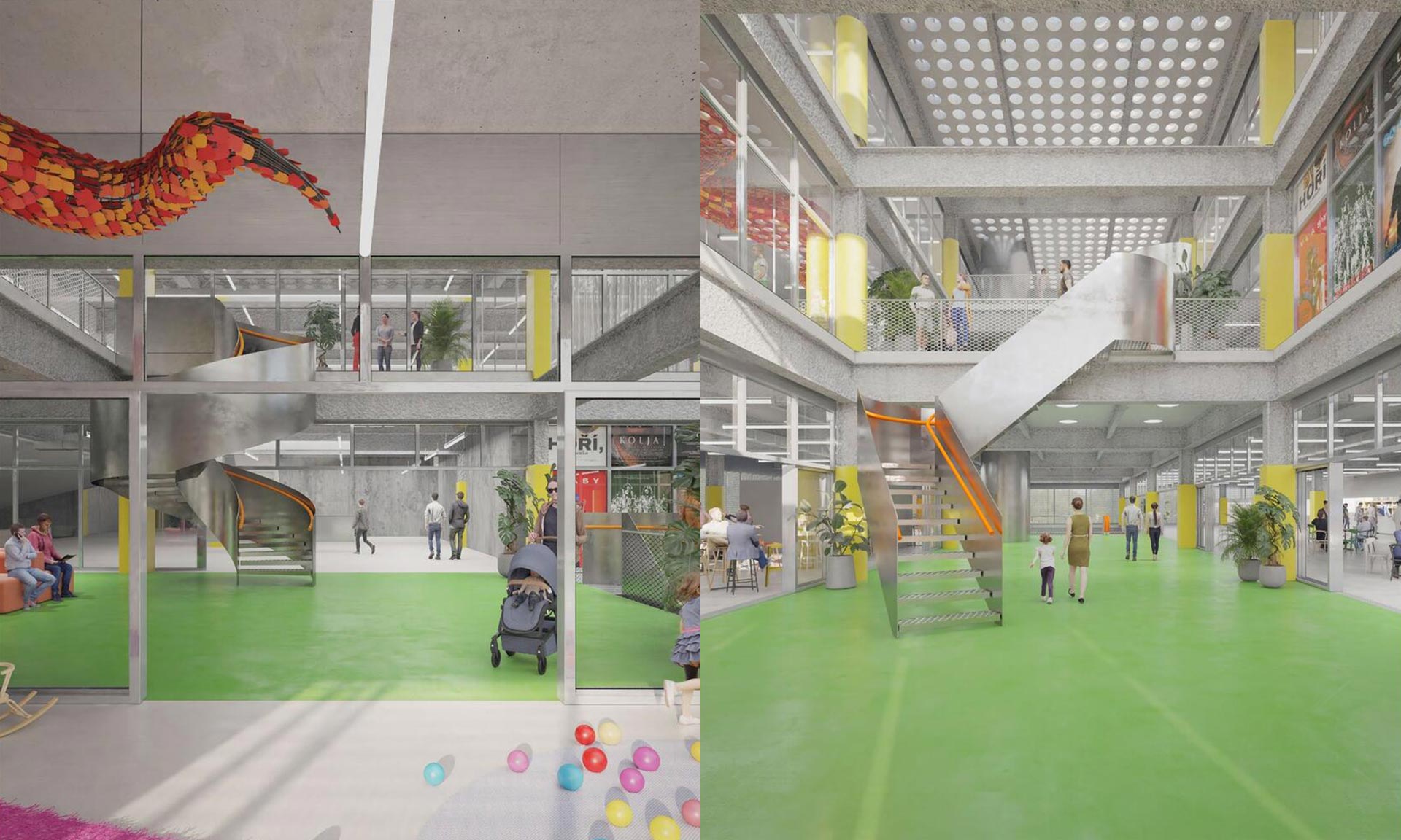 „Veřejná pasáž je navržena tak, aby poskytovala kryté veřejné prostory, podobně jako kryté náměstí, obklopené tržnicí a food courtem, restaurací, kinem, prostory pro zábavu a dětským světem. Vychází z původního konceptu pasáže, která spojovala dvě úrovně veřejného prostoru na severní a jižní straně bývalého obchodního domu. Pasáž je jediným prostorem, kde dochází k významnému zásahu do struktury budovy. Představuje nové vertikální propojení pomocí schodišť a výtahů, novou prosklenou podlahu a otevření atrií napříč více podlažími na jižní i severní straně budovy. Tento prostor slouží jako místo pobytu i odpočinku; je přehledný a snadno čitelný, pod sociálním dohledem a zároveň plynule propojený s venkovními prostory sousedícími s novým přízemím budovy na obou úrovních. Budova Prioru se musí stát magnetem městského života. Proto otevíráme obě přízemní podlaží do okolí a selektivně rozšiřujeme vnitřní mřížku nosného skeletu objektu do veřejných prostranství, které doplňujeme rozměrnými květináči se stromy, nabízející stín a posezení. Podlaha zůstává minerální, takže je snadno přístupná a otevřená pro různé účely (pivní zahrádka, sezónní trhy atd.), ale plošina se promění v zelené náměstí. Charakter veřejného prostoru dále definují dva odlišné architektonické prvky: na východě nabízí umělý kopec netradiční hřiště, zároveň však skrývá parkoviště a rozšiřuje prostor klubu pod ním; na jihu, mezi stromy, signalizuje nadrozměrná lucerna přítomnost rozsáhlého podzemního prostoru pro zábavu,“ dodávají.