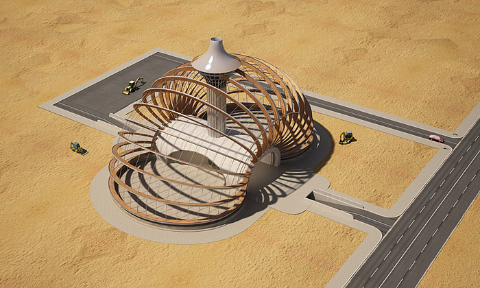 Z dřevěných prefabrikovaných oblouků a napnutých ocelových lan vyrůstá ekologická budova v podobě mušle. Montované rámy umožňují rychlé a snadné postavení. Stavební plocha pojímá pouhé 2900 metrů čtverečních, plošná výměra 4500 metrů a celková podlahová plocha dosahuje 14 000 metrů čtverečních. Rámec pokrývá fólie vyrobená z Ethyl TetrafluorEthylenu známý pod zkratkou ETFE. Tato silná transparentní fólie recykluje a čistí dešťovou vodu. Je odolnější, úspornější a lehčí než sklo. Fólii u rámu drží speciální kovové profily, které zároveň slouží jako sluneční kolektory pro ohřev vody a jako žlaby pro sběr dešťové vody z povrchu střechy.