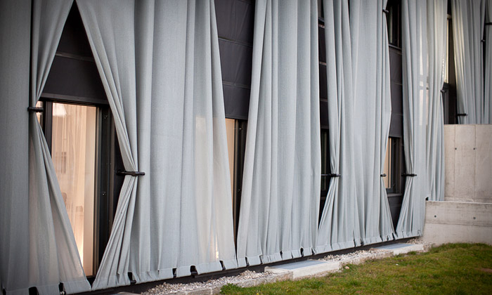 Tím nejzajímavějším na budově je však fasáda. Černé desky byly pokryty ještě šedými závěsy nataženými po celém obvodě. Řasením dostal objekt na jemnosti a díky rozhrnutí okolo oken a dveří pak na dynamičnosti a zajímavosti. Použita byla speciální měkká částečně průsvitná textilie fungující zároveň jako stínění. Dlouhé závěsy, tentokrát v bílé byly použity i v interiéru. Ten je jinak laděn do čistých barev šedé, bílé a dřeva.