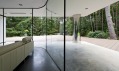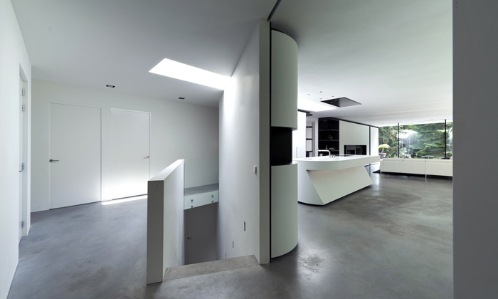 Po chodbách najdeme několik světlíků, které přivádí i do temných koutů přirozené denní světlo. Dveře do pokojů jsou nezvykle široké s minimalistickými klikami. Zajímavě řešená je i koupelna s betonovými stěrkami po stěnách a s teplejším druhem osvětlení. Sprchový kout od prostoru s vanou, nad níž je úchvatné panoramatické okno, dělí mléčné tabule velkého skla.