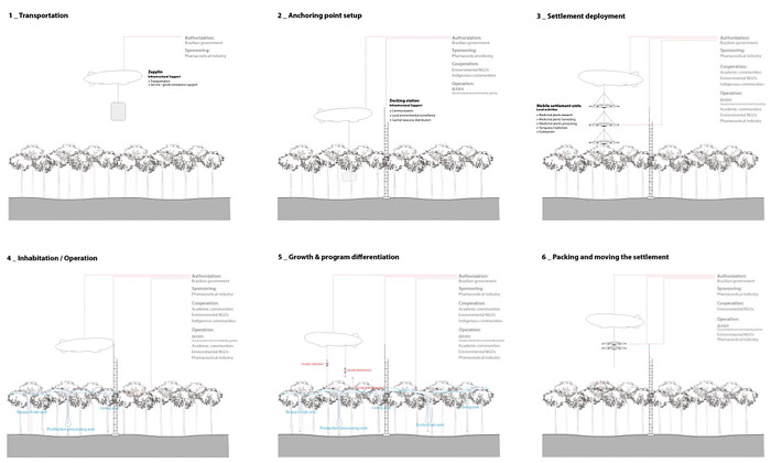 Navrhované pralesní zázemí pro vědce je složeno z lehkých lusků a plošin, které se dostanou až nad koruny stromů. Vědci na nich mohou sklízet a studovat léčivé pralesní rostliny. V zavěšených luscích jsou pak navrženy výzkumné laboratoře a obytné jednotky, v případě potřeby lze všechny tyto lusky stáhnout až k zemi. Síť ze syntetických vláken a ocelové podpory drží každý lusk na svém místě a vytvářejí pevný přístřešek nad stromy.