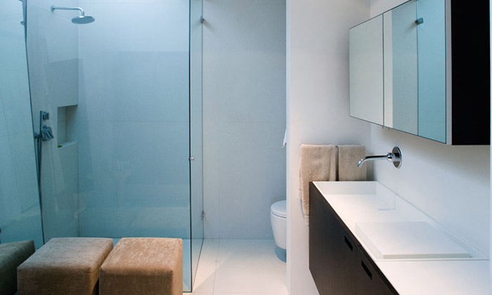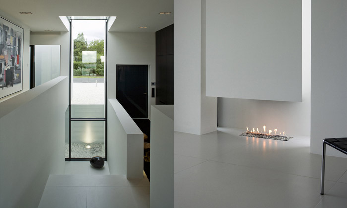 Interiér o užitné ploše 457 metrů čtverečních je celý podřízený velkým proskleným oknům, které směřují do soukromé zahrady. Dominantní bílou vkusně doplňuje černá v minimalistickém až funkcionalistickém nábytku a pečlivě vybraných stylových doplňcích.
