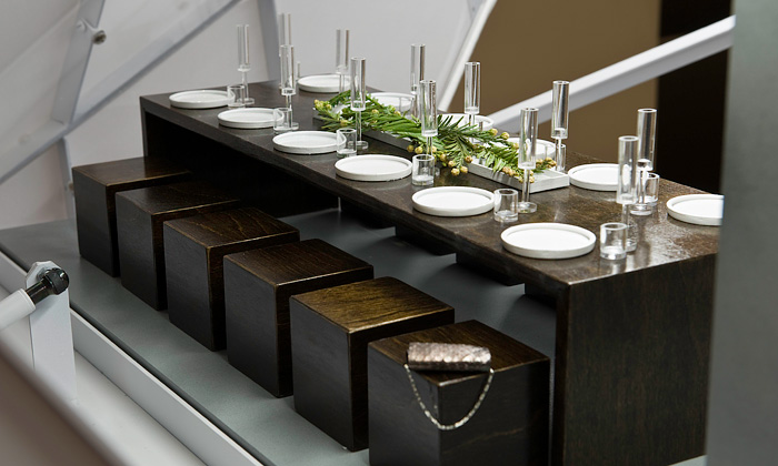 Nemalá výloha se tak počátkem prosince přeměnila na futuristický levitující domov. Po stěnách výlohy byly vylepeny černobílé fotografie města New York, které navozují atmosféru a mezi oba pomyslné bloky byl pomocí vypínaných konstrukcí vsazen odlehčený model domova budoucnosti, který je podle Rozmiarka vytvořen s ohledem na potřeby moderního městského žití.