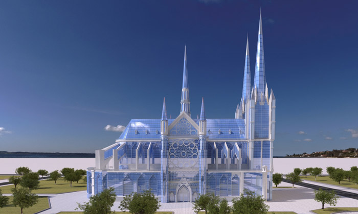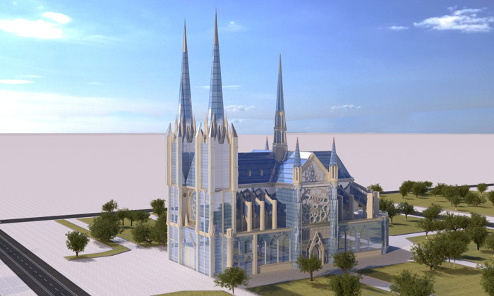 Ruský všeuměl Vasily Klyukin se rozhodl zachovat základní rysy katedrály a na vizualizacích ji postavit z betonu, skla a oceli, jako kdyby byla stavěna v dnešním 21. století ze současně populárních materiálů. Opěrný systém je tedy z klasického šedého betonu, na něhož je připevněna ocelová konstrukce opláštěná skleněnými panely do modré barvy.