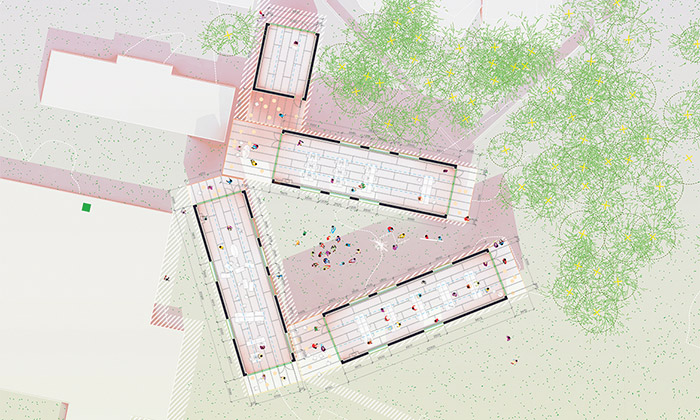 Uspořádáním hmot studií vzniklo neformální nádvoří a meziprostory, které jsou pravidelně opticky propojeny s interiérem pomocí velkých ploch oken. Vzniklé verandy dopomohly k otevřenosti a propojení s okolní přírodou a kampusem samotným, ale zároveň poskytují prostor pro sociální a vizuální interakce studentů.
