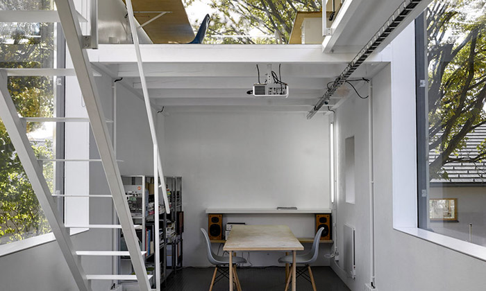 Obě části domu mají surově pojatý interiér. Pracovní část je bílá. V přízemí jí dominuje jednací stůl se židlemi Vitra DSW, regály a projekční plochou. V prvním patře najdeme pracovní stoly s výhledem do zeleně. Obytná část má interiér černý. Přízemí dominuje kuchyňský kout, krb a jídelní kout. V prvním patře najdeme šatnu a ložnici.
