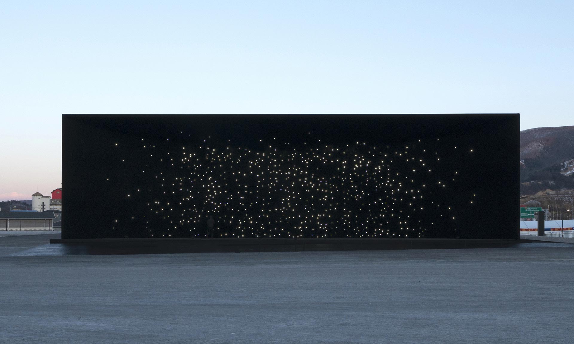 Britský architekt a designér Asif Khan dokončil v jihokorejském Pchjongčchang svůj unikátní pavilon, která je označována za nejtmavší stavbu na planetě Zemi. Objekt tvaru kvádru je natřen několika vrstvami speciální barvy Vantablack, která dokáže pohltit téměř sto procent světla. Interiér nabízí instalaci s kapající vodou.