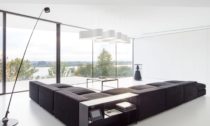 Přízemí domu je efektně prosklené a bílou hmotu tak nese první patro. Bělostná kombinace byla zachována i v interiéru o užitné ploše 599 metrů čtverečních, kde bílé v podobě stěna vestavěného nábytku kontrastuje s nábytkem a některými svítidly. Propojení s okolní přírodou je tak maximální, interiér je čistý a přesto funkční.