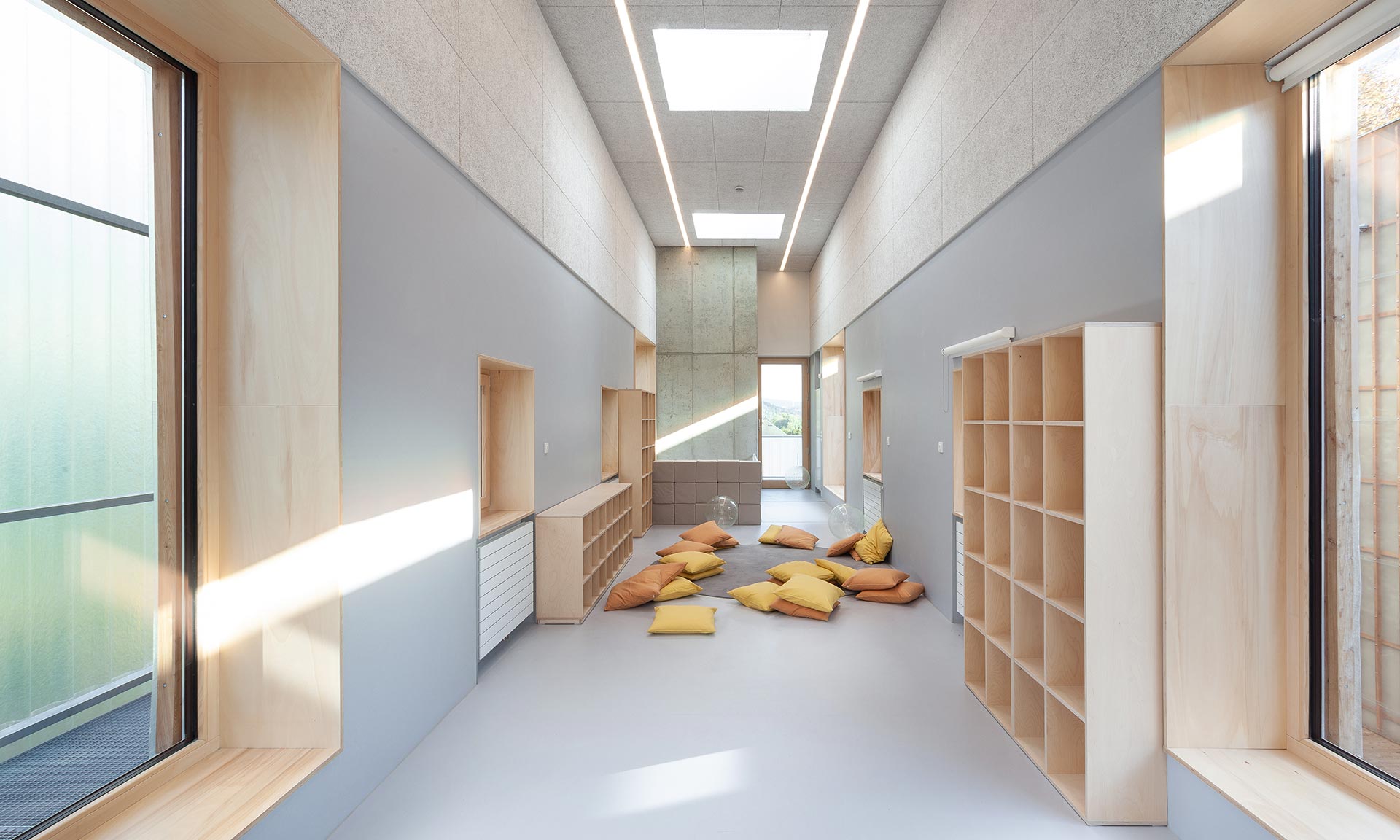 Interiér s celkovou užitnou plochou 425 metrů čtverečních je vlastně jedna velké prolézačka s různými prostory učenými pro různé aktivity. Nejvyšší patro slouží jako učebna, v přízemí najdeme jídelnu pro 30 dětí a čtyři dospělé, dále dvě oddělení pro dvakrát 25 dětí, kabinet pro čtyři vychovatele, kancelář pro vedoucího a hospodáře školky, nechybí ani místa pro přípravu jídla, šatny zaměstnanců či úklidové a technické místnosti. Interiér je vesměs světlý, ale díky použití dřeva hřejivý. Náklady na výstavbu byly 40 milionů korun.