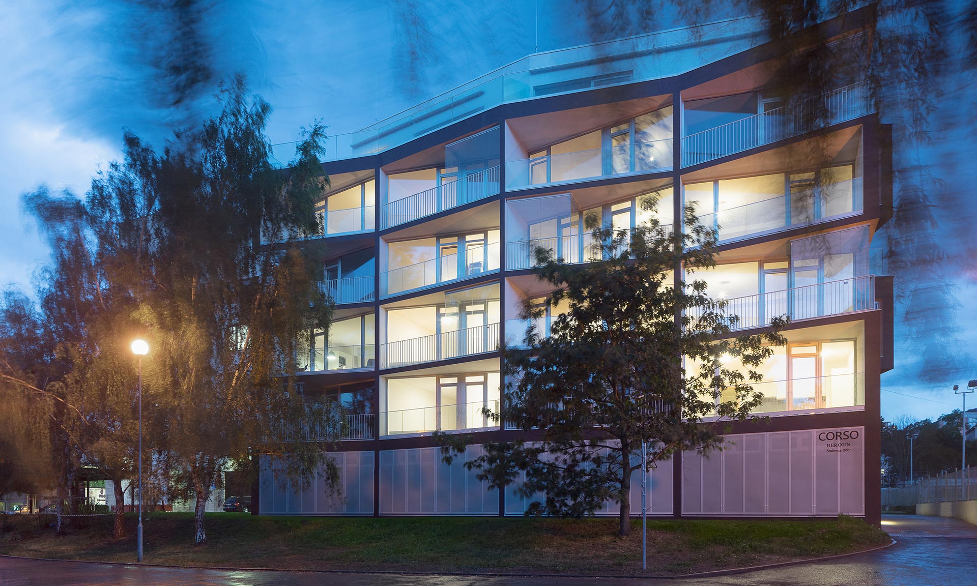 „Bytový dům orientovaný k nábřeží kultivuje okolní prostředí a pomáhá integrovat stavbu z dob komunismu do struktury města. Dům je orientován na východ k řece zalamovanou fasádou – každý byt se otevírá prosklenou stěnou k řece. Dynamiku fasády umocňuje střídání otevřených lodžií se zasklenými zimními zahradami,“ říkají ke svému poslednímu projektu architekti Jiří Opočenský