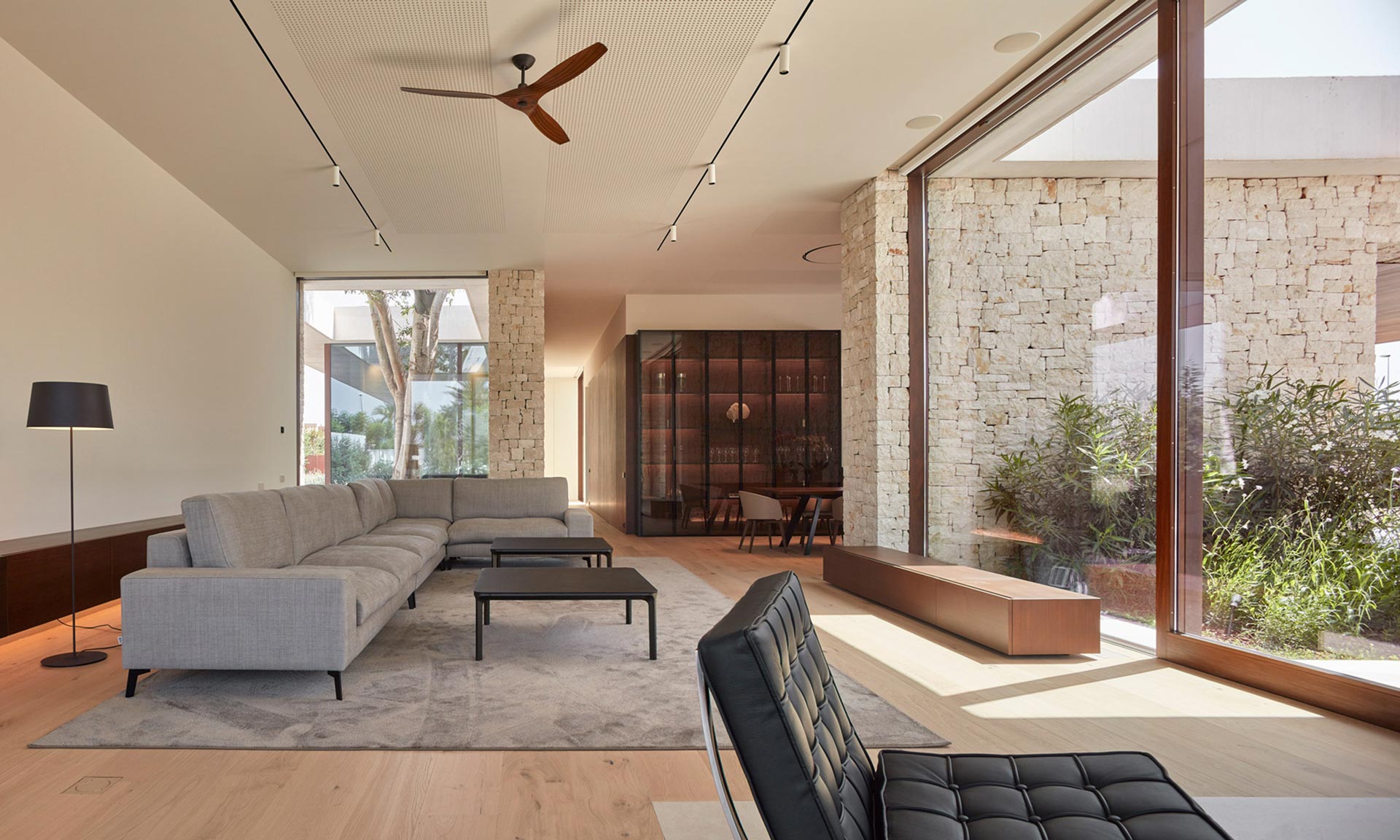 Ramón Esteve se svým studiem navrhli okolo domu hned několik teras, krytých i nekrytých, na nichž je několik typů posezení. Nechybí minimalistický přepadový bazén zarovnaný s okolní sluneční terasou. Exteriér prostupuje do interiéru dvěma různými druhy. Prvním je velké prosklení a malá átria se zelení či prorůstajícími stromy. Druhý jsou samotné materiály jako obložení kamenem, přiznaný beton či dřevo.