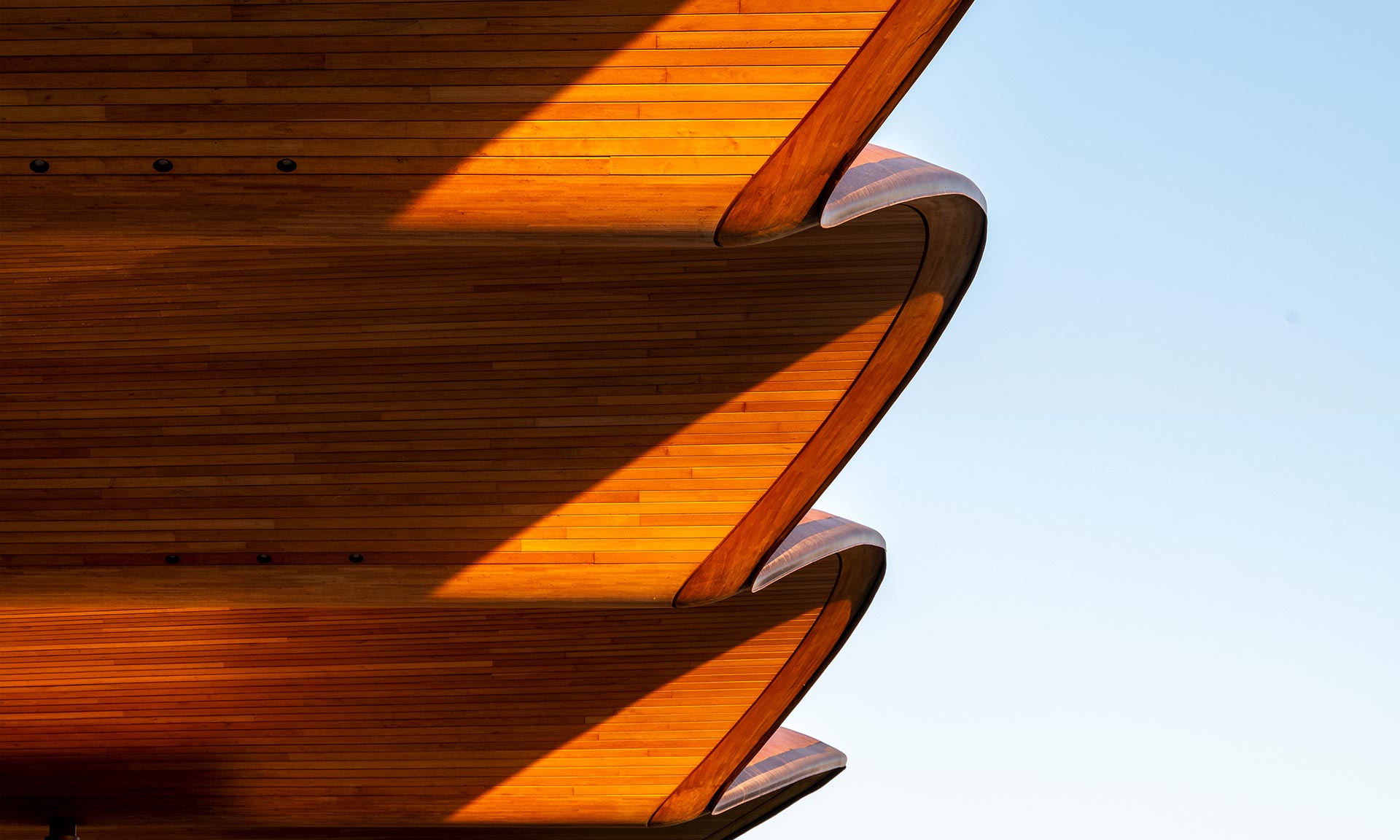 Norman Foster se svým studiem Foster + Partners otevřeli vilu do zahrady vysokými prosklenými stěnami sahající až ke střeše, kterou tvoří sedm velmi elegantních vln obložených zespodu dřevem. Právě tato kombinace otevřeného prostoru, skla a zvlněného dřeva působí velmi nezvykla, hřejivě a originálně. Navazující terasa s bazénem je dále zařízena pro trávení volného času venku, převislá střecha pak chrání od přímého slunečního svitu.
