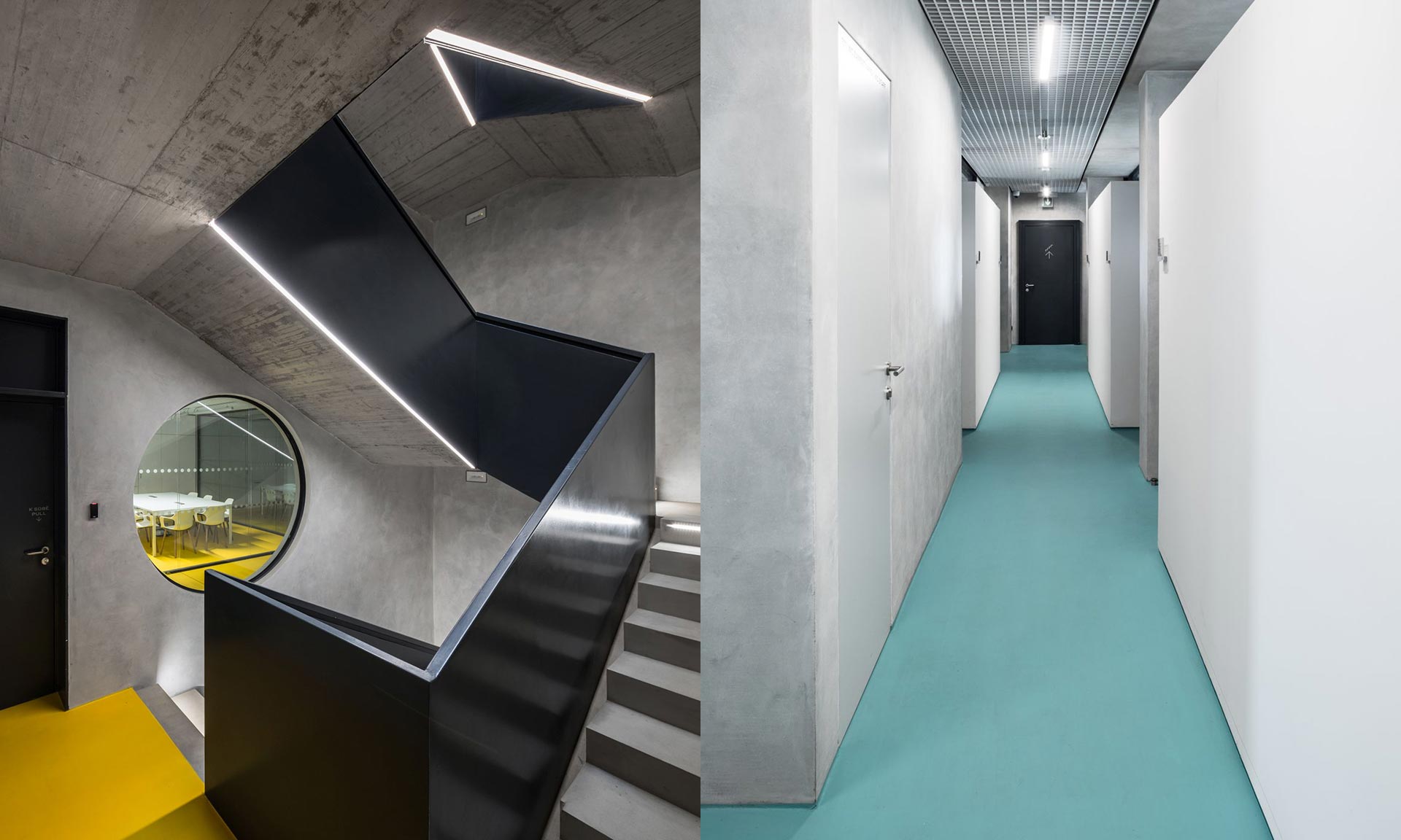 Interiér o celkové užitné ploše 4 635 metrů čtverečních působí svěže, moderně, ale hlavně nadčasově. Architekti se snažili prostor rytmizovat a chtěli aby byly rozpoznány hranice mezi novým a starým, nosným a vloženým. Použito je hodně pohledového betonu, jednoduché barevnosti a doplňkem jsou barevné podlahy. Celkový vjem je industriální, ale přesto hřejivý. V objektu najdeme krom řady kanceláří také dva sály. Celkové náklady včetně nákupu původní budovy byly 362 milionů korun, což je třetina původního projektu.