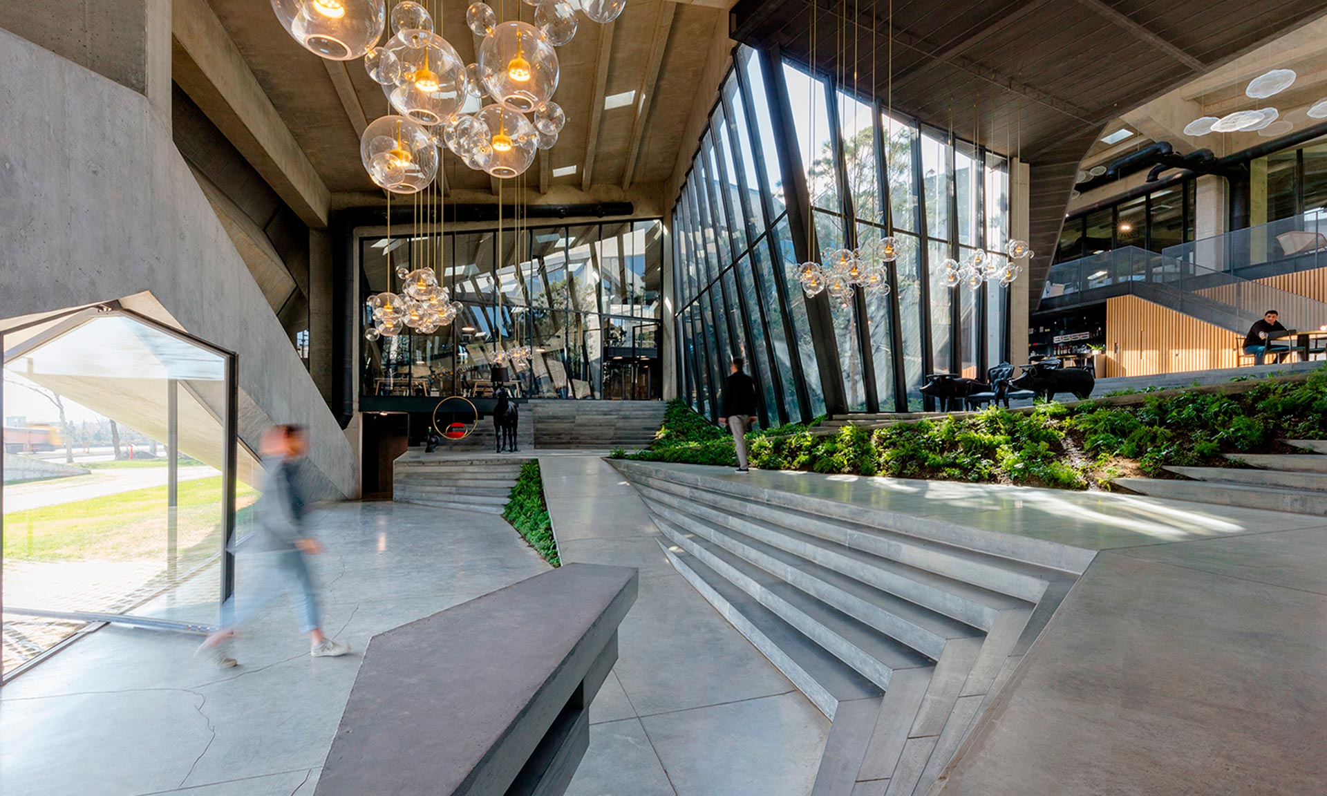 Hmota budovy je skládaná z třech různě zalamovaných plátů betonu trochu působících jako šedé těsto. Díky naprosté absenci oken vypadá neprostupně. Vstupy jsou navrženy jako výklenky nebo menší brány. Střecha je kompletně zelená s velkými okny nebo světlíky.