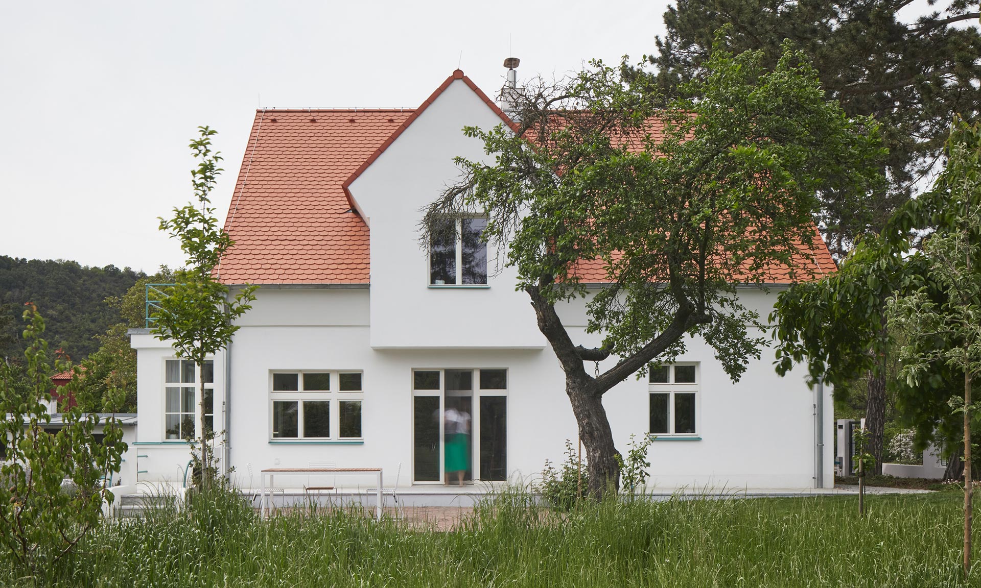„Architektonické řešení je založeno na očištění stávajícího rodinného domu od nevhodné přístavby garáže. Místo garáže je navržena jednoduchá hmotu vstupu, která nenaruší charakter rodinné vily. Kryté stání se sjezdem na komunikaci je v projektu umístěno na hranici pozemku a je přístupné po nově upravované pěší cestě k hlavnímu vstupu do domu i na stávající terasu. Dále byla provedena rekonstrukce stávajícího oplocení v délce 47,5 m směrem do ulice. V interiéru rodinného domu jsou navrženy dispoziční změny, které vyžadovaly zvětšení některých otvorů v nosných stěnách, vybourání některých příček a zvětšení otvorů na fasádě směrem do zahrady. Charakter a hlavní hmota domu byla zachována. Návrh v exteriéru zahrnoval výměnu okenních výplní, zateplení objektu, novou omítku a novou střechu,“ uvádí architekti.