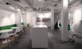 Velkoprostorovou kancelář zútulňují obrovské stoly z masivního dřeva, které přímo lákají k práci a tvorbě poctivých a zábavných řešení pro klienty reklamní agentury. Na stoly jsou použity dřevěné dýhy v různých barevných odstínech, což vytváří v místnosti hravě kostkovaný efekt.