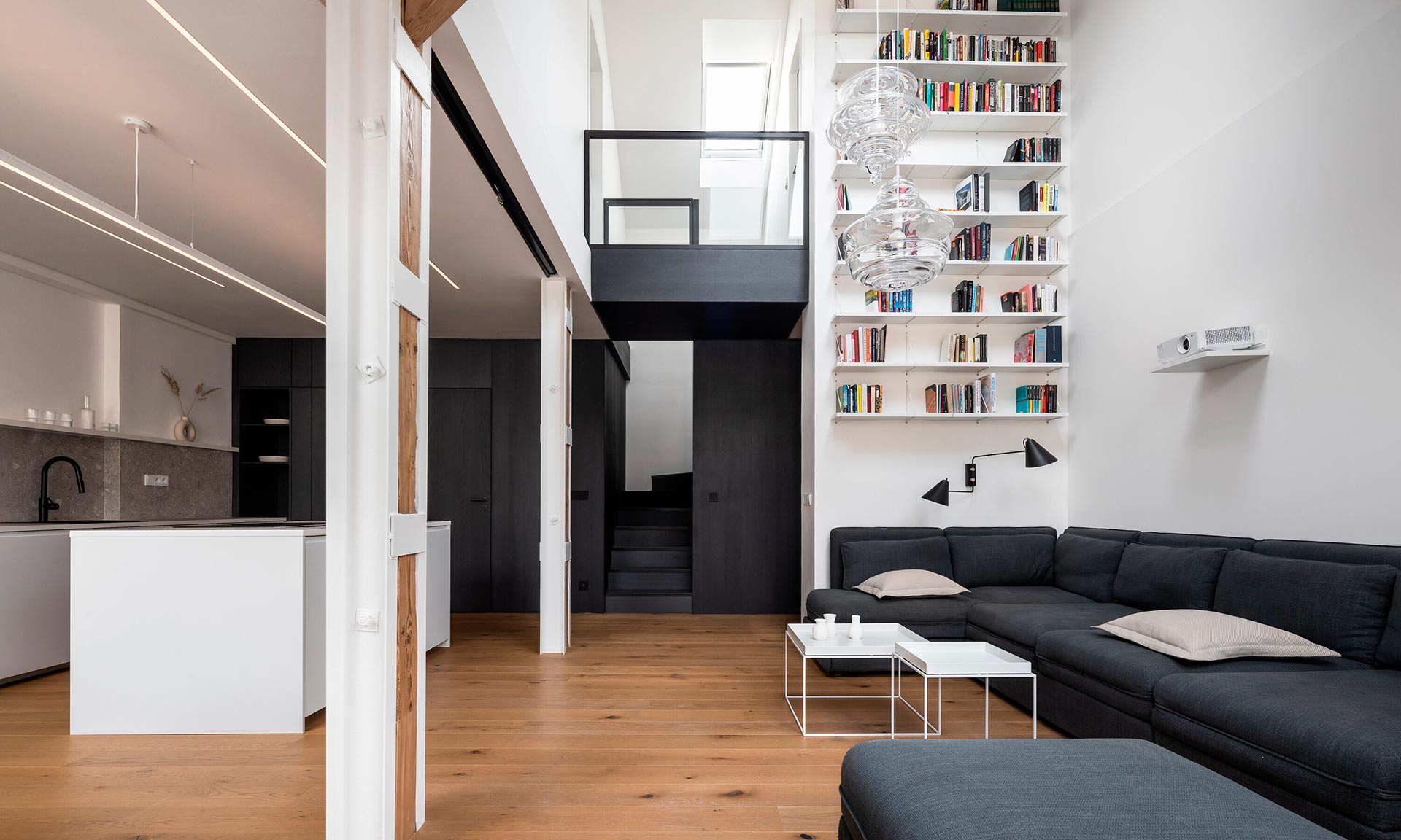 „Využili jsme hlavní kvality podkroví, jeho výšku. Obývacího pokoj s velkou knihovnou otevíráme přes dvě podlaží. Do těžiště prostoru vkládáme černý box, srdce bytu, které skrývá provozní zázemí, slouží jako schodiště s lávkou do patra a vpouští světlo do jinak tmavé předsíně. Zjednodušili jsme tím původní dispozici bez nutnosti velkých stavebních úprav,“ uvádí architekt Martin Gaberle.