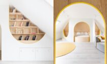 Na interiéru je příjemná jeho nenásilnost. Díky implementaci řady oblouků ve žlutém lemování je prostor hravý, zářivý a přesto útulný Dělící příčky navíc decentně oddělují místo s postelí od prostoru obývacího a čtecího nebo pracovního. Apartmán je možné pronajmout krátkodobě. Jistě totiž má sociální zázemí a malou kuchyňku, která však rekonstrukci nepotřebovala a zůstala nám tak na fotografiích skrytá.