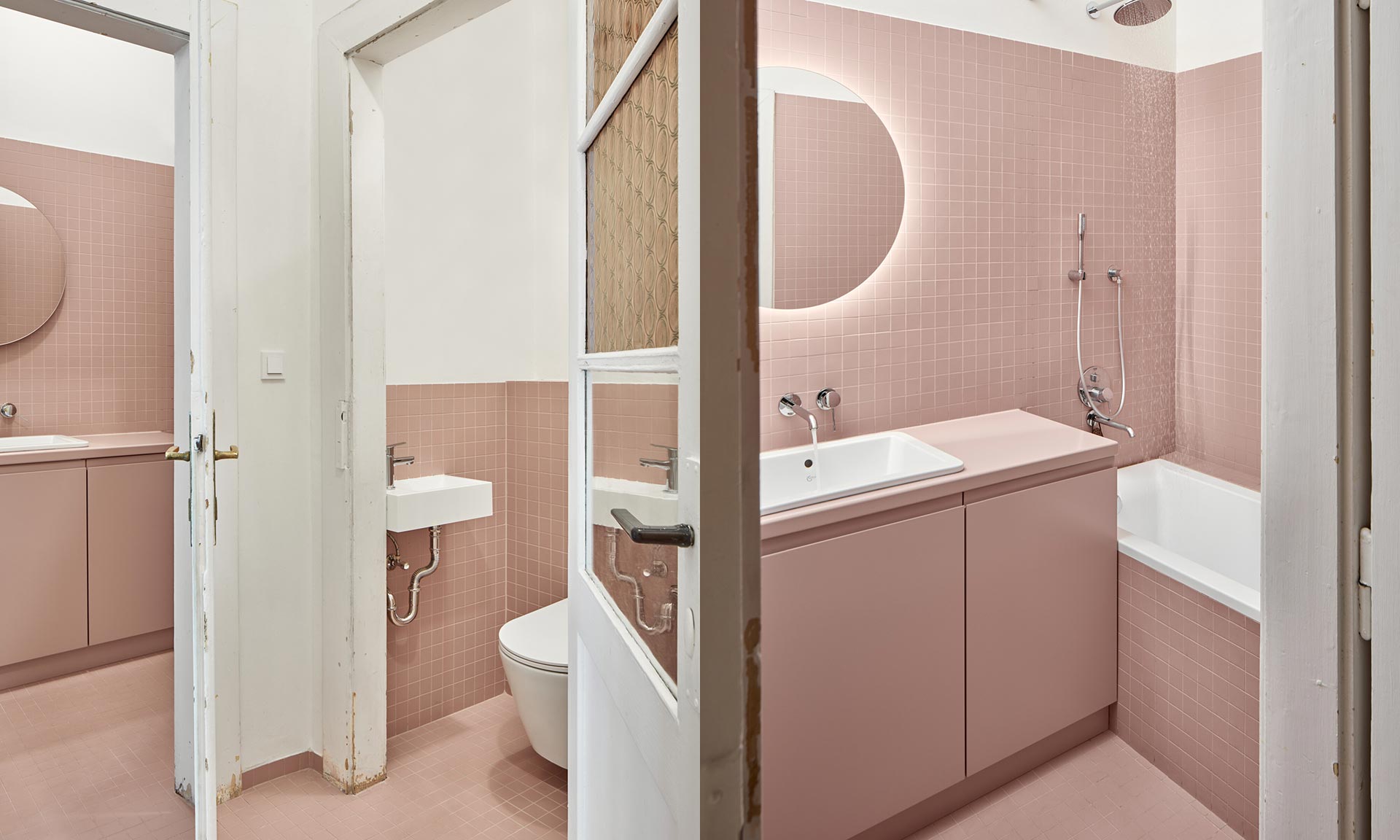 Dvojice architektů z pražského ateliéru Neuhäusl Hunal proměnila malý žižkovský byt pro jejich kamaráda. Rekonstrukci bytu dominuje růžová, která pohltila celý kuchyňský kout, koupelnu i toaletu. V nově otevřeném obývacím prostoru je dominantní multifunkční dřevěné pódium z překližky, které slouží jako postel, úložný prostor i k posezení.