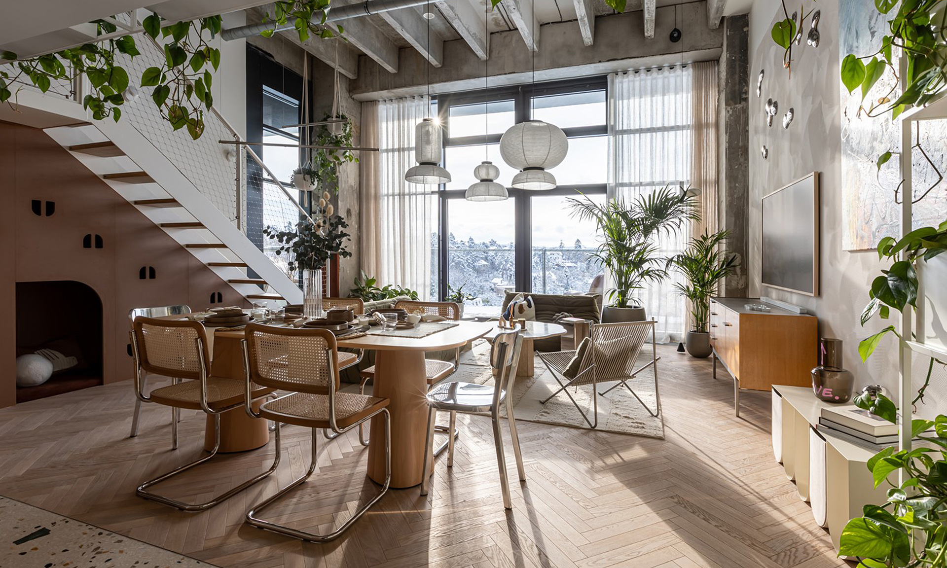 „Celému loftu vévodí upcyclingový styl života, důkazem toho jsou repasované sedačky Togo, vintage travertinový stolek, nový kabát starého Halabala křesla, na terase stolky vyrobené ze zbytků odřezků při jádrovém vrtání a další. Děti jsou pro majitele loftu na prvním místě, a tak jsou jednotlivé části loftu hravé, působí pozitivně na kreativní dětskou duši a přímo ji ovlivňují a vtahují do nekonečné hry. Barevné a materiálové ladění podpořené bauhaus tvaroslovím podporuje plynulost prostoru, práce s čistými liniemi a racionalita jednotlivých prvků s mírnou dávkou eklektismu zajišťuje, že všechny prvky pospolu budou odolávat proměnlivým trendům a vytváří tak stylově harmonický celek,“ dodávají.