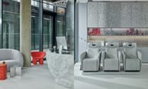 I když je interiér kadeřnického salónu, který má celkovou užitnou plochu 155 metrů čtverečních, laděn do šedých a kovových odstínů, je i přesto vcelku útulný. I když mu chybí květiny a hřejivé tóny, je díky červeným akcentům v podobě kusového nábytku nebo třeba elementu kuchyně zajímavě oživen. Nezvykle působí do modra i do růžova laděná toaleta nebo sochařsky pojatá recepce. Oproti původnímu interiéru je ten nový výrazně odlišný.