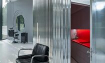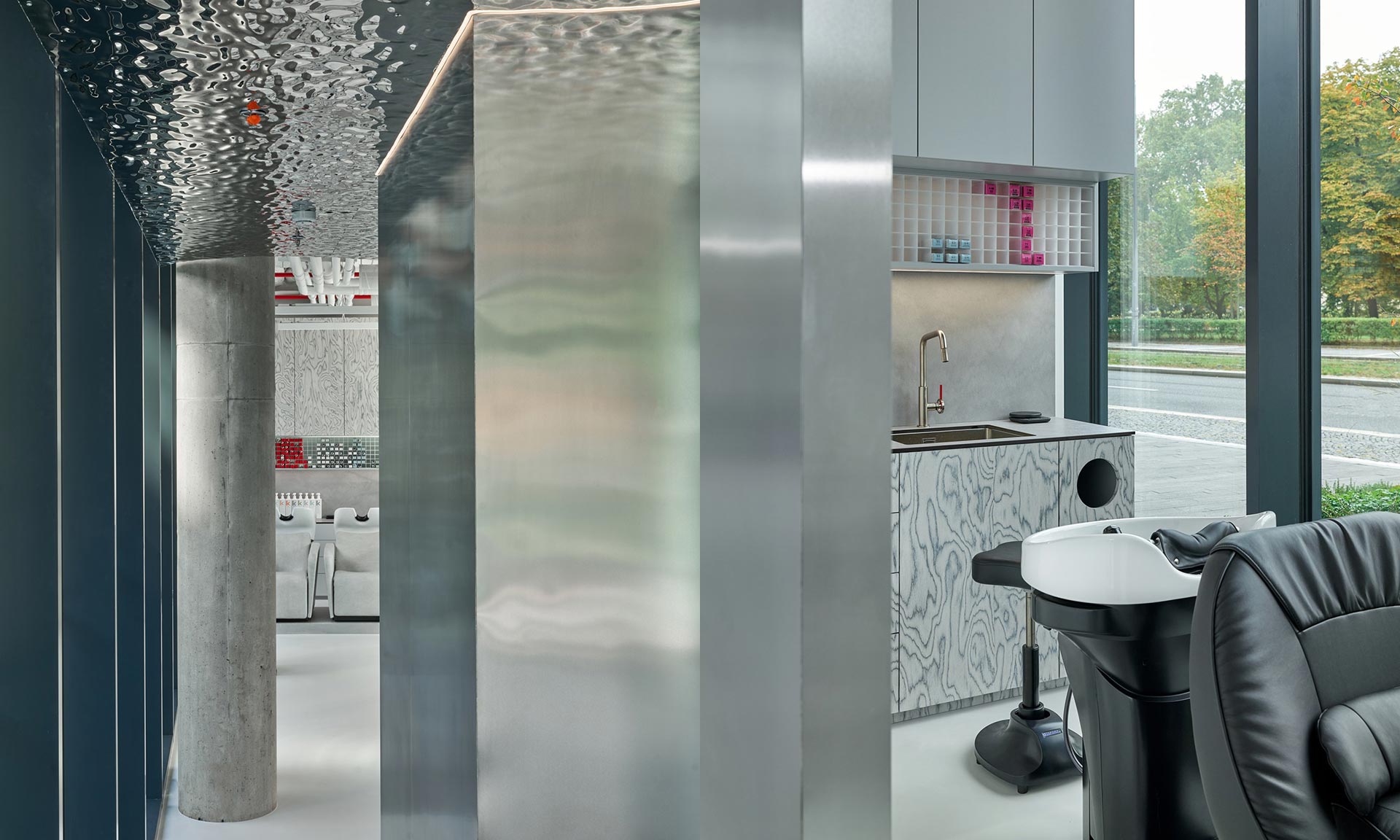 „Exkluzivitu a intimitu poskytuje VIP mycí box, diskrétně ukrytý za plechovou stěnou. Klient zde má stoprocentní soukromí, které lze dále umocnit stíněním na okenních stranách, a i závěsy v rámci kovové konstrukce. Přechod mezi jednotlivými zónami prostoru je umocněn chodbou, která se stává zážitkem sama o sobě. Zvlněný podhled z ohýbaného plechu vytváří iluzi vodní hladiny, čímž dodává prostoru jemný pohyb a světelnou hru. Kovová améba nejen definuje prostor, ale zároveň obaluje jádro zázemí salonu, v němž se nachází úložné prostory s šatnou, kuchyňky, technická místnost a sociální zázemí,“ dodávají k interiéru.