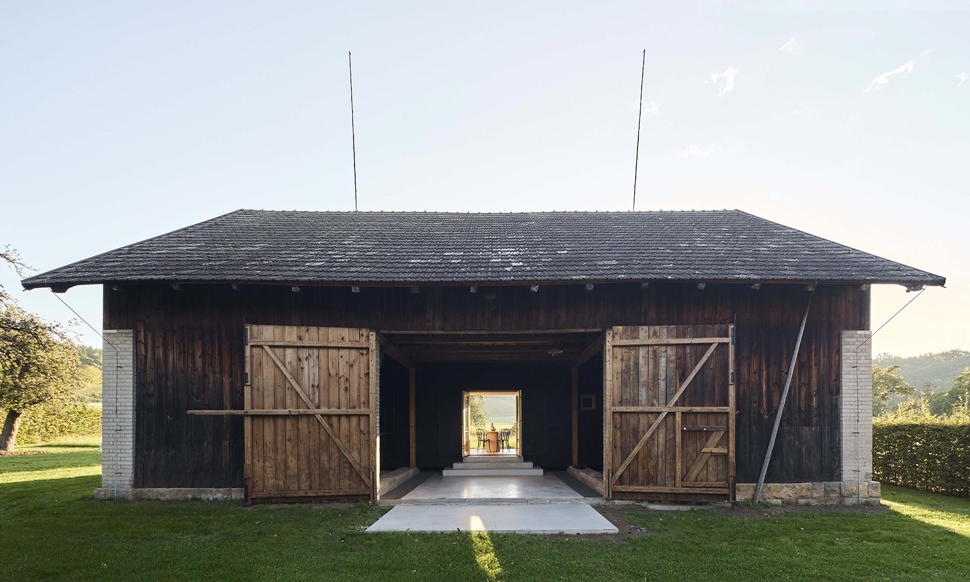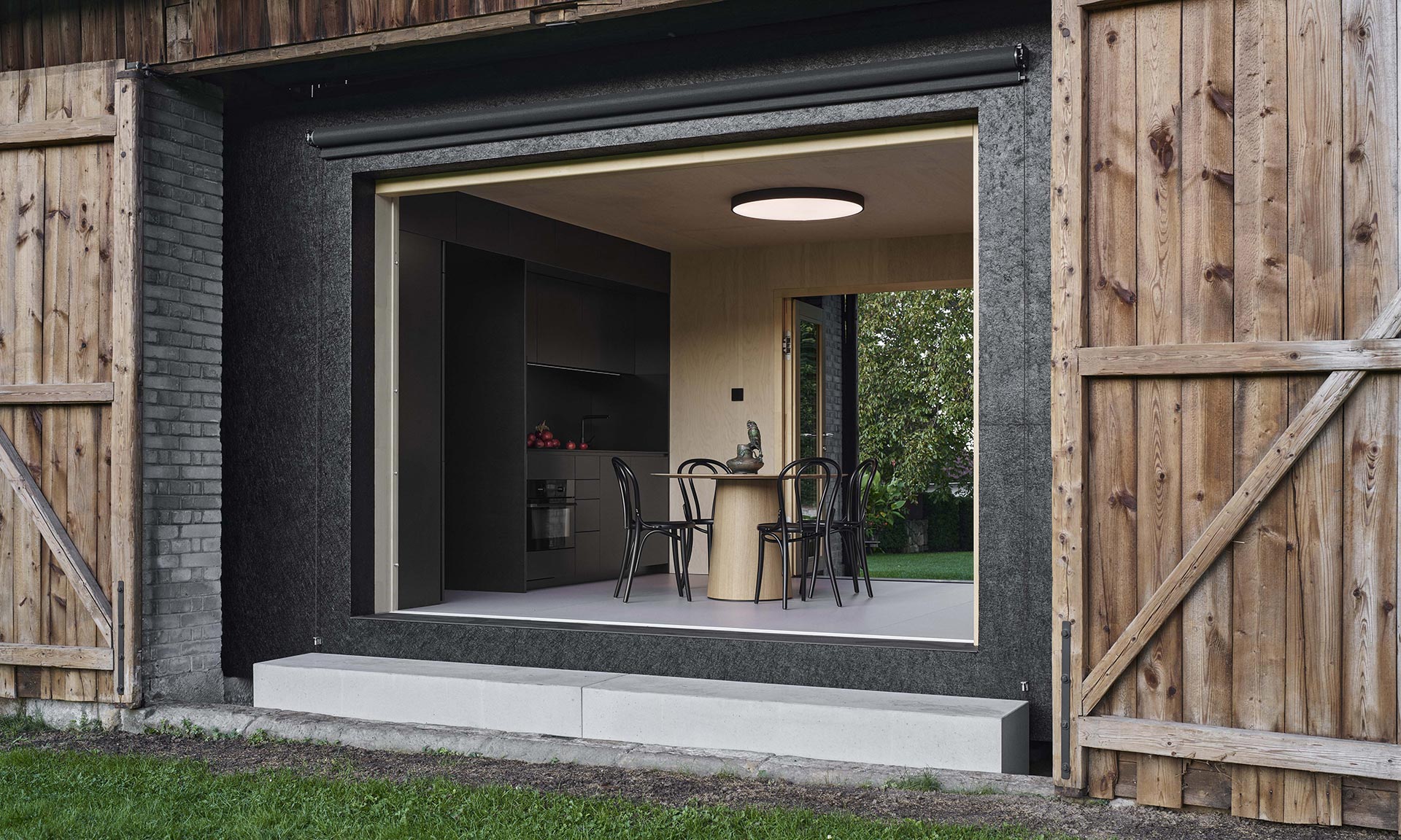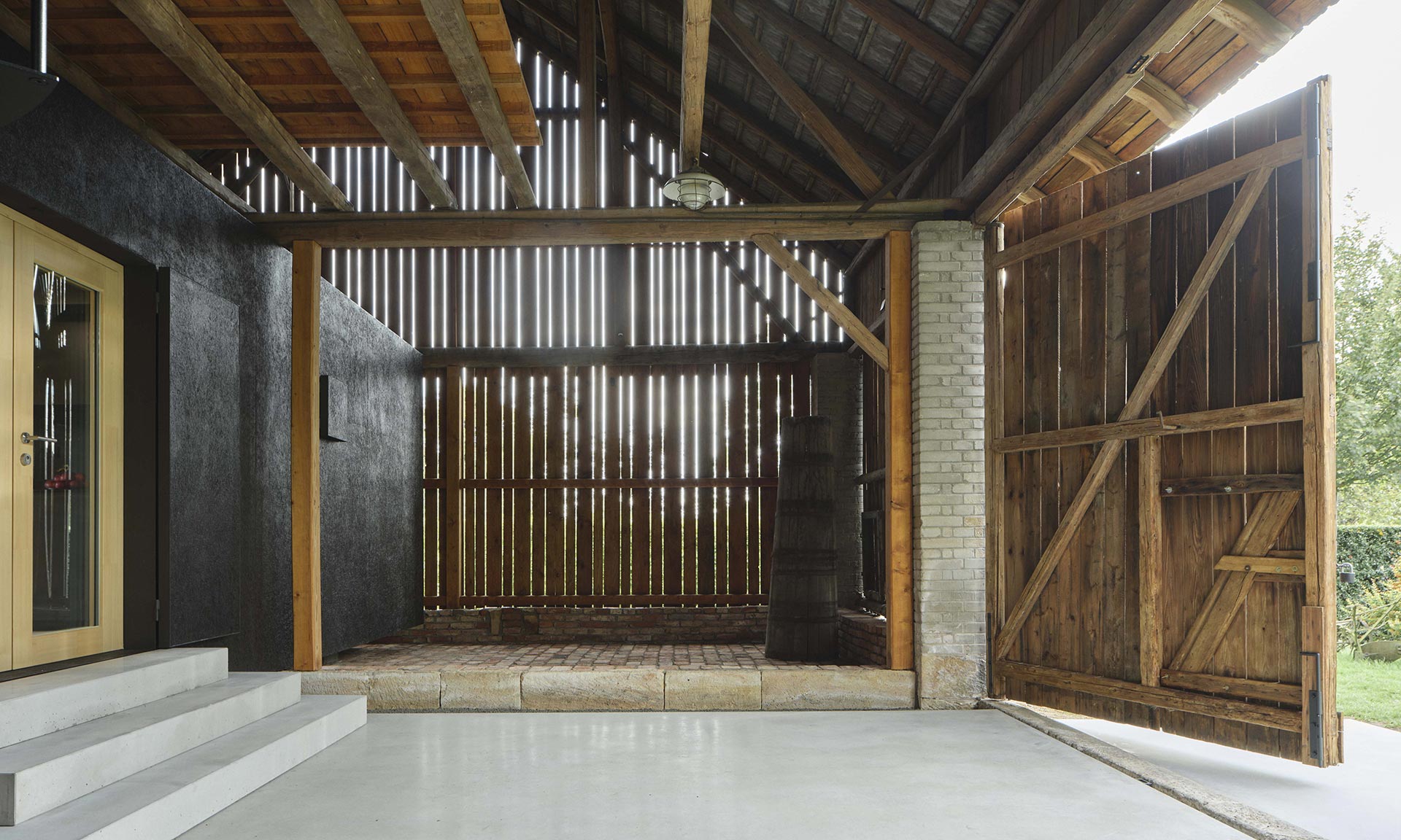 „Navrhli jsme malou jednotku pro sezonní pobyt vestavěnou do stodoly u venkovské usedlosti. Volně vložená dřevostavba ve formě kvádru je zabalena do černé asfaltové obálky. Samotná stodola si zachovává původní podobu a se zavřenými vraty a bočními okenicemi nic nenasvědčuje tomu, že se uvnitř nachází nový objekt. Jen do dvora přesahuje betonový koberec, který se po otevření vrat dál rozprostírá přes prázdnou polovinu stodoly až k monolitickým stupním před vstupem,“ říká architekt Matěj Nepustil.