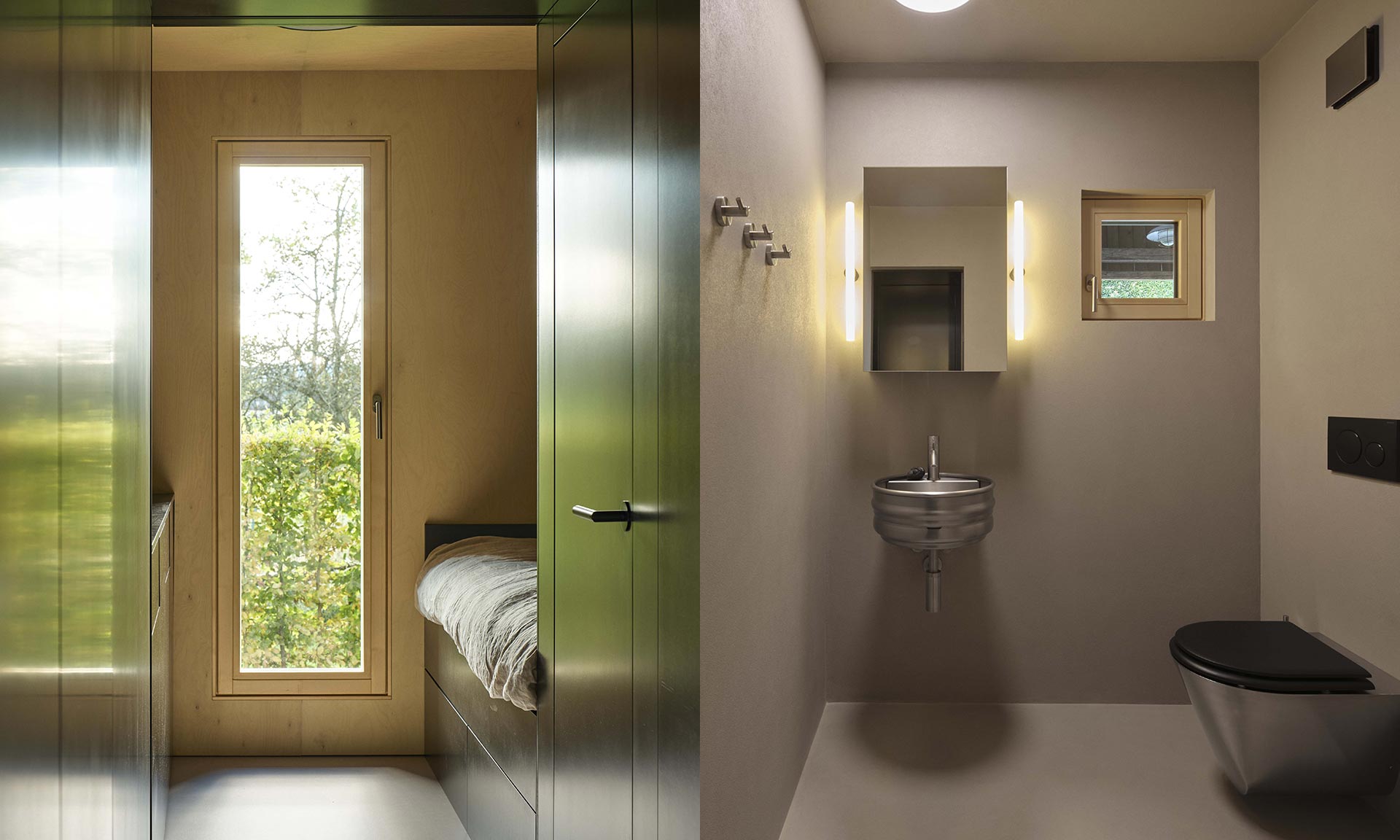 „Do lapidárního interiéru vyloženého březovou překližkou je vsazen blok kuchyně s vestavěným nábytkem a koupelnou, který odděluje hlavní prostor od spací kóje. Po otevření vrat se před velkým posuvným oknem rozlévá zahrada se starými jabloněmi a za ní pole s cestou stoupající k lesu,“ dodává k projektu rekonstrukce, která je v podstatě i novostavbou samostatné jednotky.