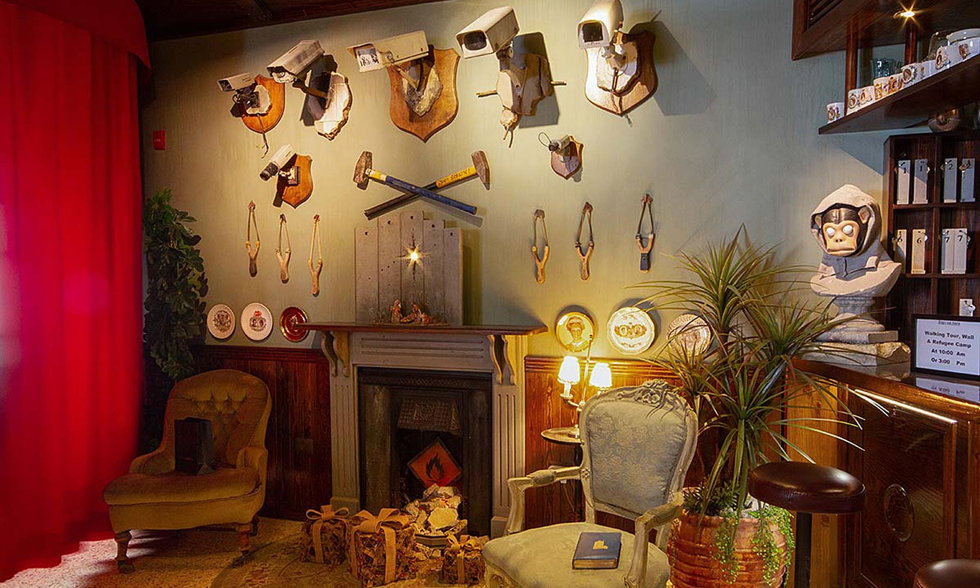 V roce 2017 otevřel britský umělec Banksy v palestinském městě Betlém nevídaný The Walled Off Hotel, který měl podtitul Hotel s nejhorším výhledem na světě. Po událostech v zemi v roce 2023 byl hotel až do dnešních dní uzavřen a nyní se znovu otevírá. Na čtyřech podlažích jsou k dispozici čtyři typy pokojů od ekonomického ve sklepě až po prezidentské. Nechybí bar, galerie, muzeum a knihkupectví. Vše je plné vtipu a Banksyho umění.