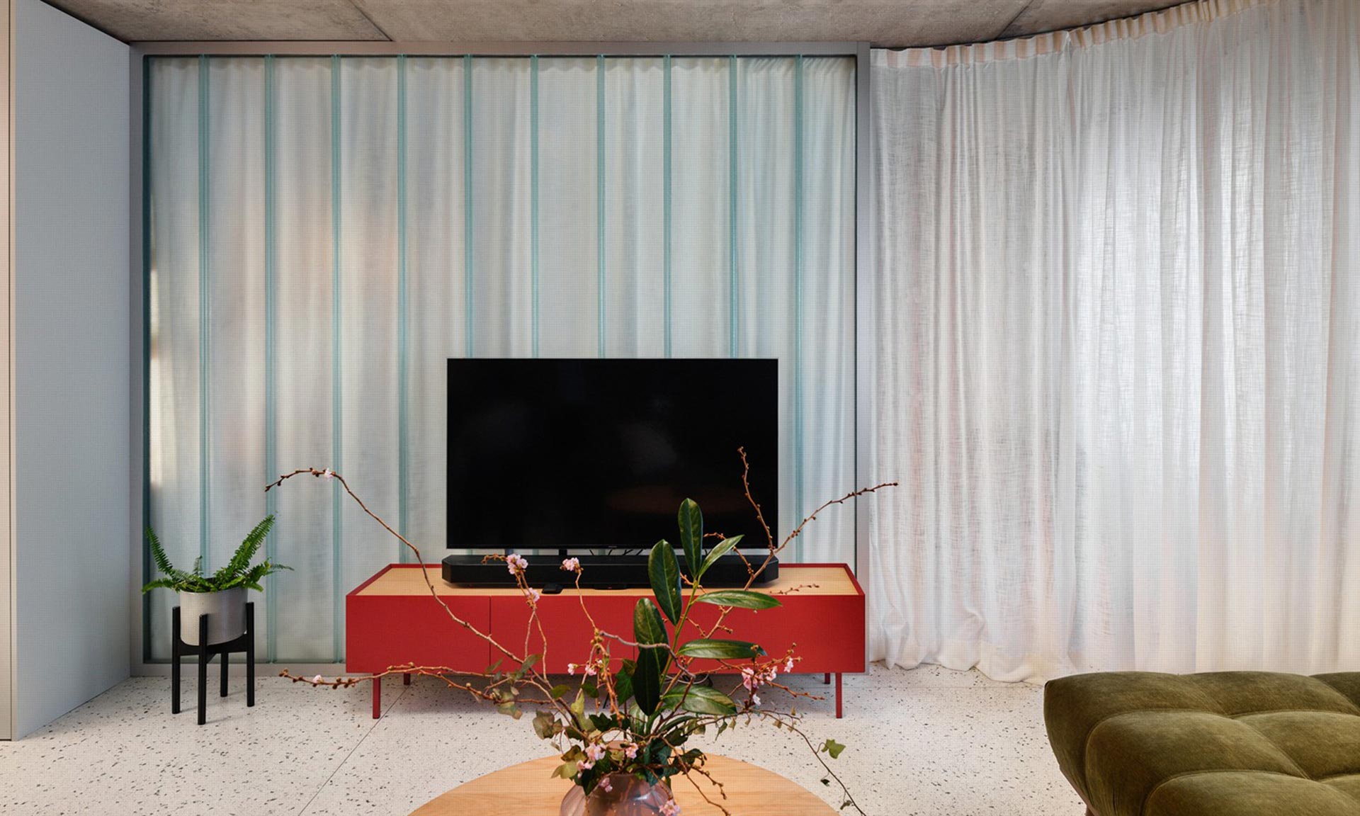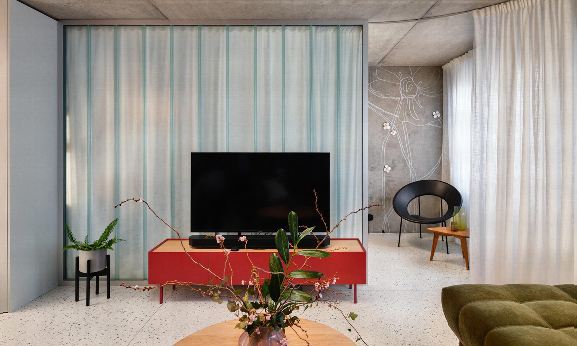 V České republice je asi 80 tisíc panelových domů s více jak 1,2 milionem bytů. Jejich životnost je prodlužována rekonstrukcemi, které potřebují i samotné byty. Jednou ze zajímavých rekonstrukcí je i byt nazvaný U vodopádu, který ve svém interiéru odvážně odhaluje maximum ze svých konstrukčních prvků. Výrazná je dělící stěna z copilit i způsob oddělení prostor závěsy. Nepřehlédnutelné jsou malby na stěnách.