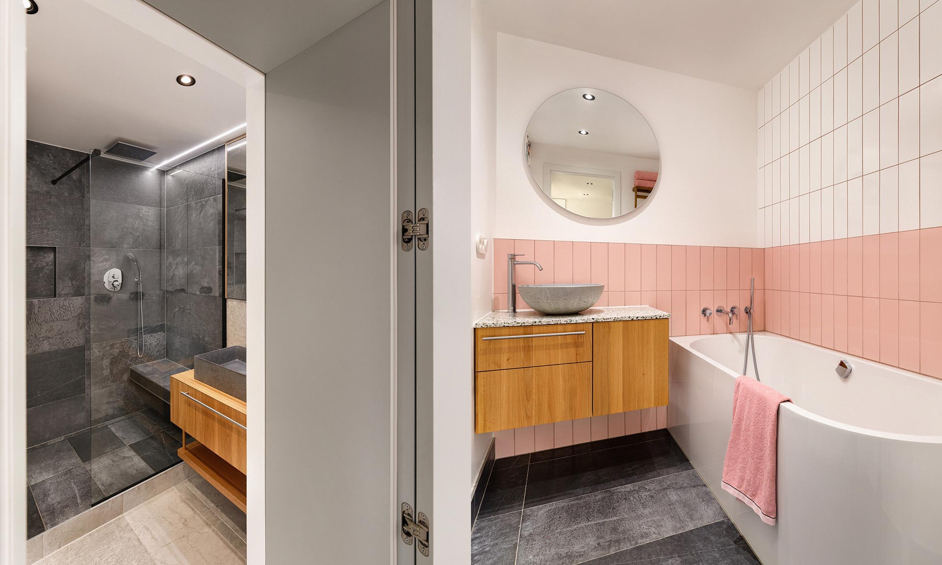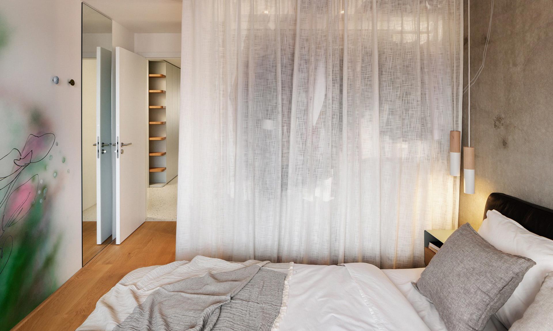 „Princip zvětšení a provzdušněni je uplatněn také v hygienickém zázemí bytu. Ze stávající malé koupelny a dvou toalet vzniká jedna prostornější koupelna s vanou (a pračkou) a jedna ne o mnoho menší koupelna se sprchovým koutem a WC. Tvrdost betonu je cíleně zjemňována interiérovými textiliemi, jednak podél copilitové příčky (pro možnost ještě většího soukromí) a navazující skříně, jednak v ložnici nově vytvořenou šatnou, oddělenou závěsem. Beton je ještě dále možno zjemňovat kresbami či dekoracemi. Samozřejmostí v návrhu je umístění množství úložného prostoru, kromě zmíněné šatny jsou to vestavné skříně v chodbě, šatna v předsíni, úložný prostor v nové větší komoře a také skříň v pracovně, jejíž součástí může být pracovní stůl,“ dodává.