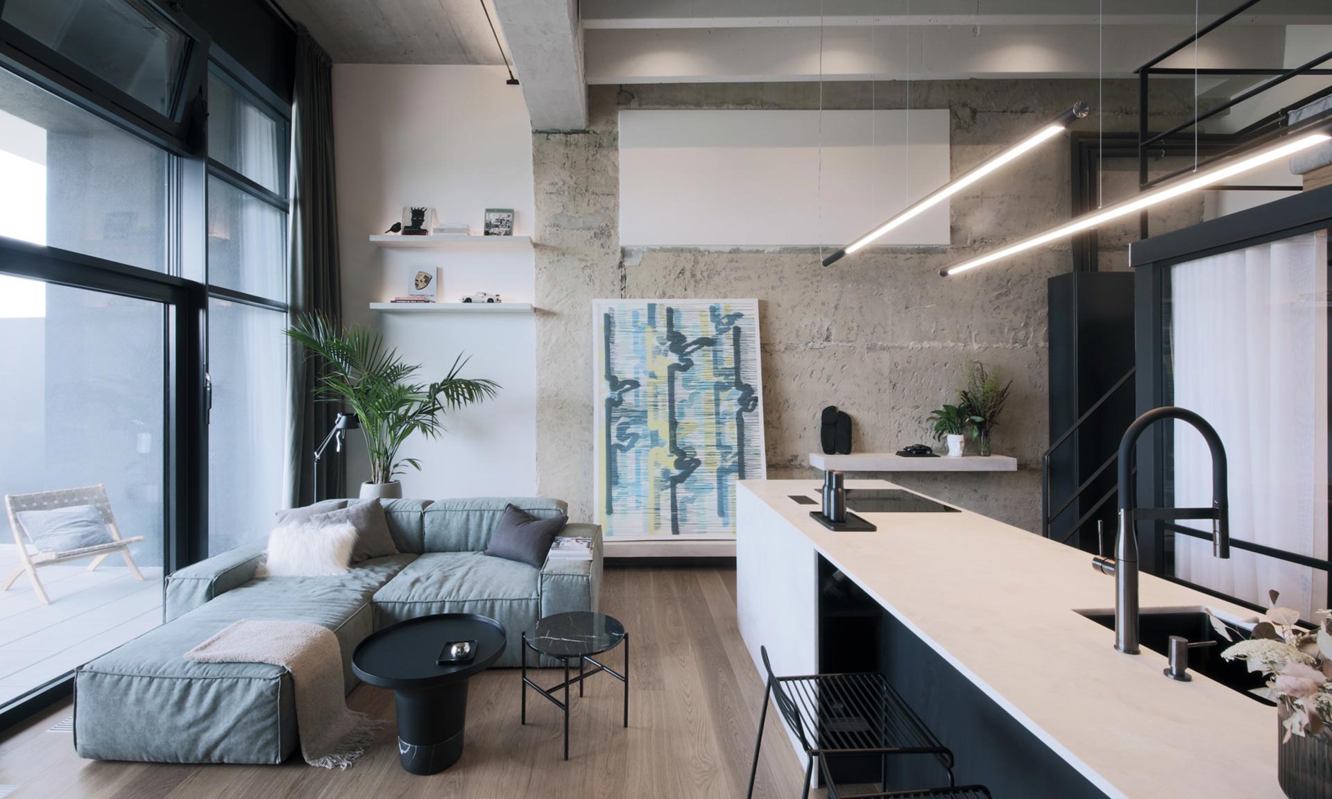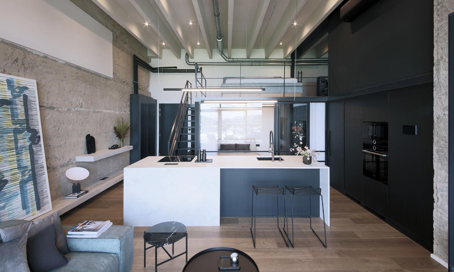 „V interiéru byla zachována původní železobetonová stěna, která vytváří kontrast s jemnými jádrovými omítkami, jež dodávají prostoru potřebnou eleganci a vizuální lehkost. Nedokonalosti železobetonových trámových stropů byly elegantně potlačeny aplikací jemně šedé barvy, která stropy opticky sjednocuje. Podlahová krytina v nejvyšší kvalitě dodává bytu teplo a útulnost, aniž by narušovala industriální charakter prostoru. Výrazným prvkem je i prosklená industriální ocelová příčka, která umožňuje dennímu světlu pronikat do pokoje pro hosty, a zároveň zachovává vizuální kontinuitu interiéru. Ocelová konstrukce patra i nábytkové prvky, jako je technologická skříň, byly ponechány v surové podobě a ošetřeny matným transparentním lakem. Sváry na konstrukci byly decentně přebroušeny, aby si interiér zachoval autentický industriální výraz. Kuchyňský ostrůvek se stal jedním z klíčových prvků bytu. Klient si přál pracovní desku z Technistonu, nakonec byl ostrůvek z tohoto materiálu zhotoven celý. Světlý žíhaný dekor byl zvolen nejen pro estetický kontrast s ostatními prvky, ale také pro svou nenáročnost na údržbu,“ dodává.