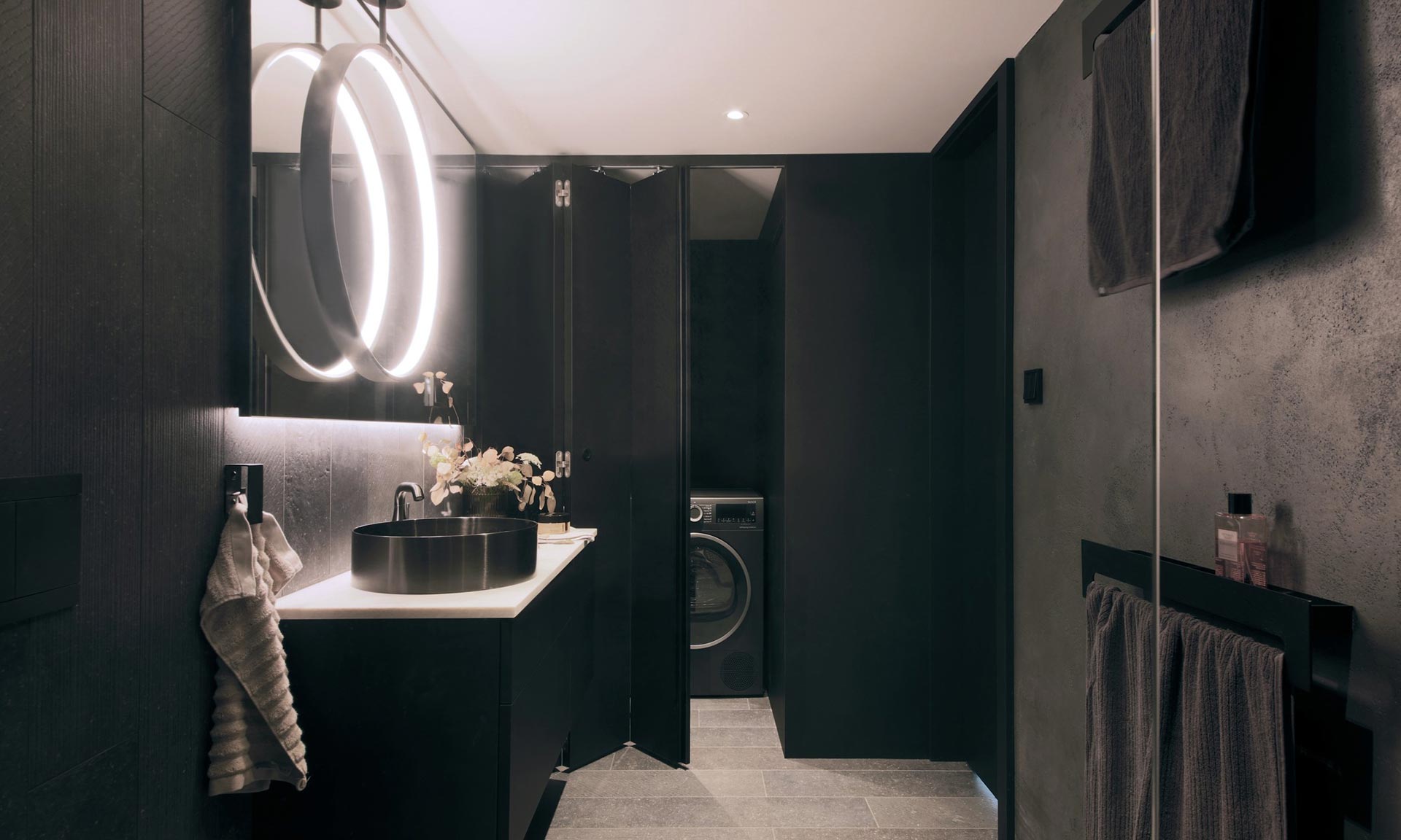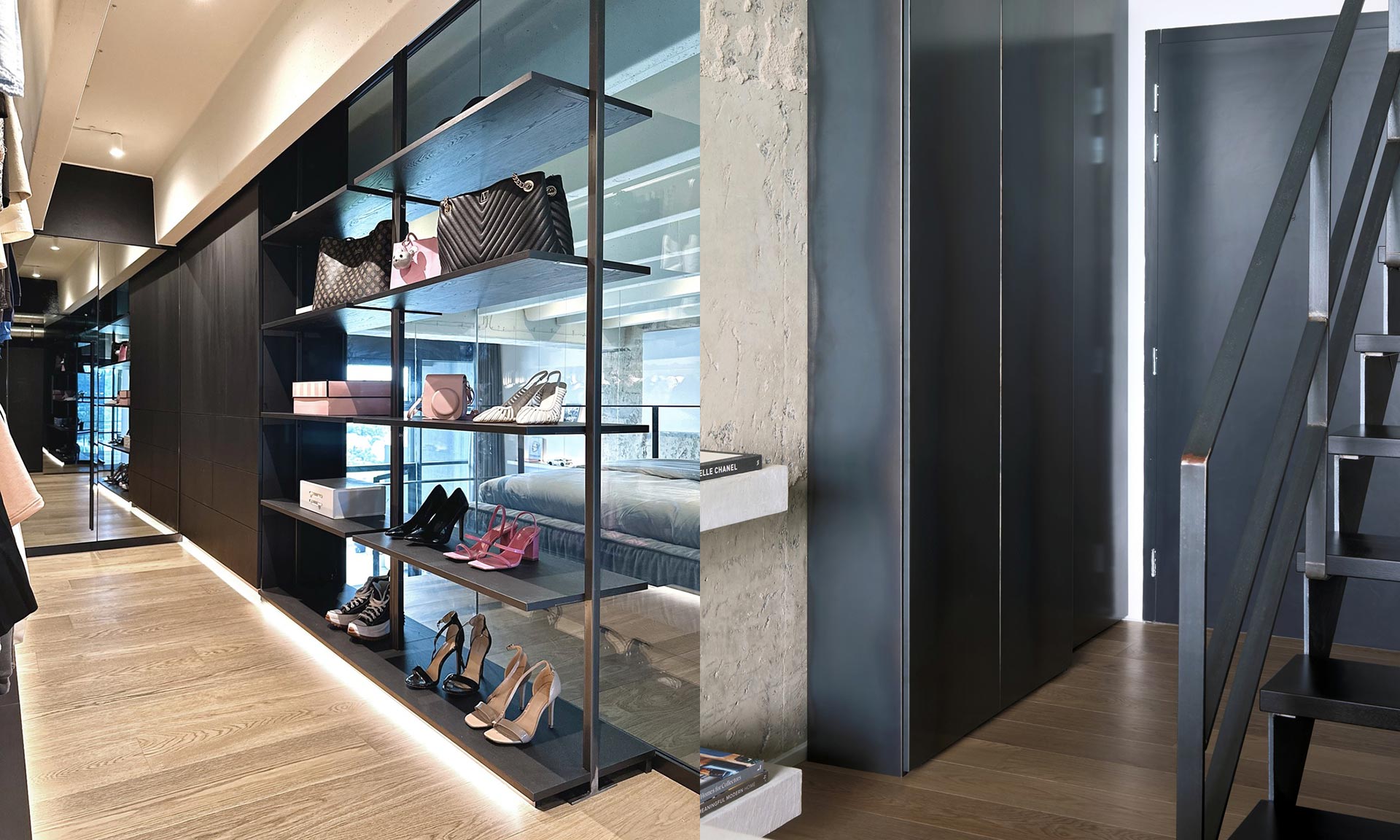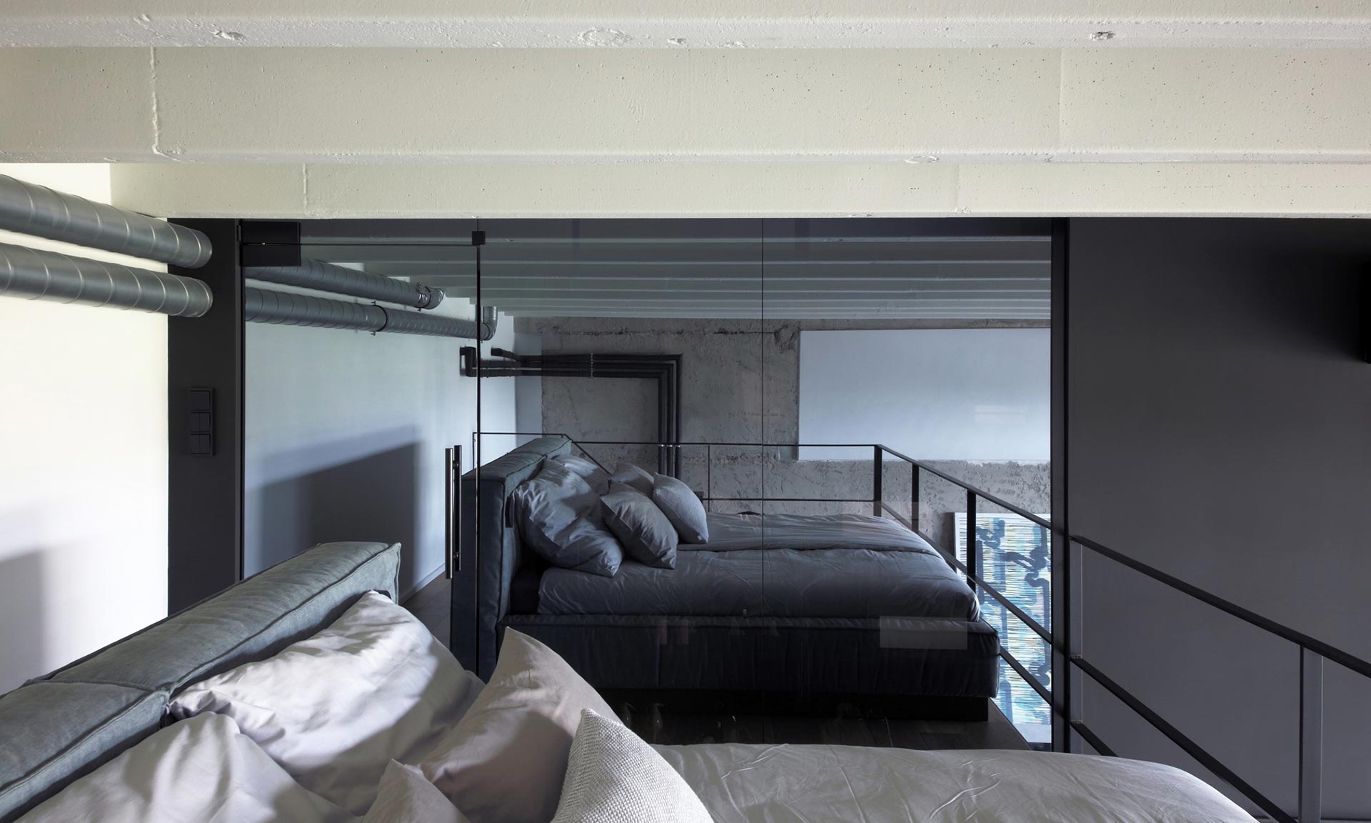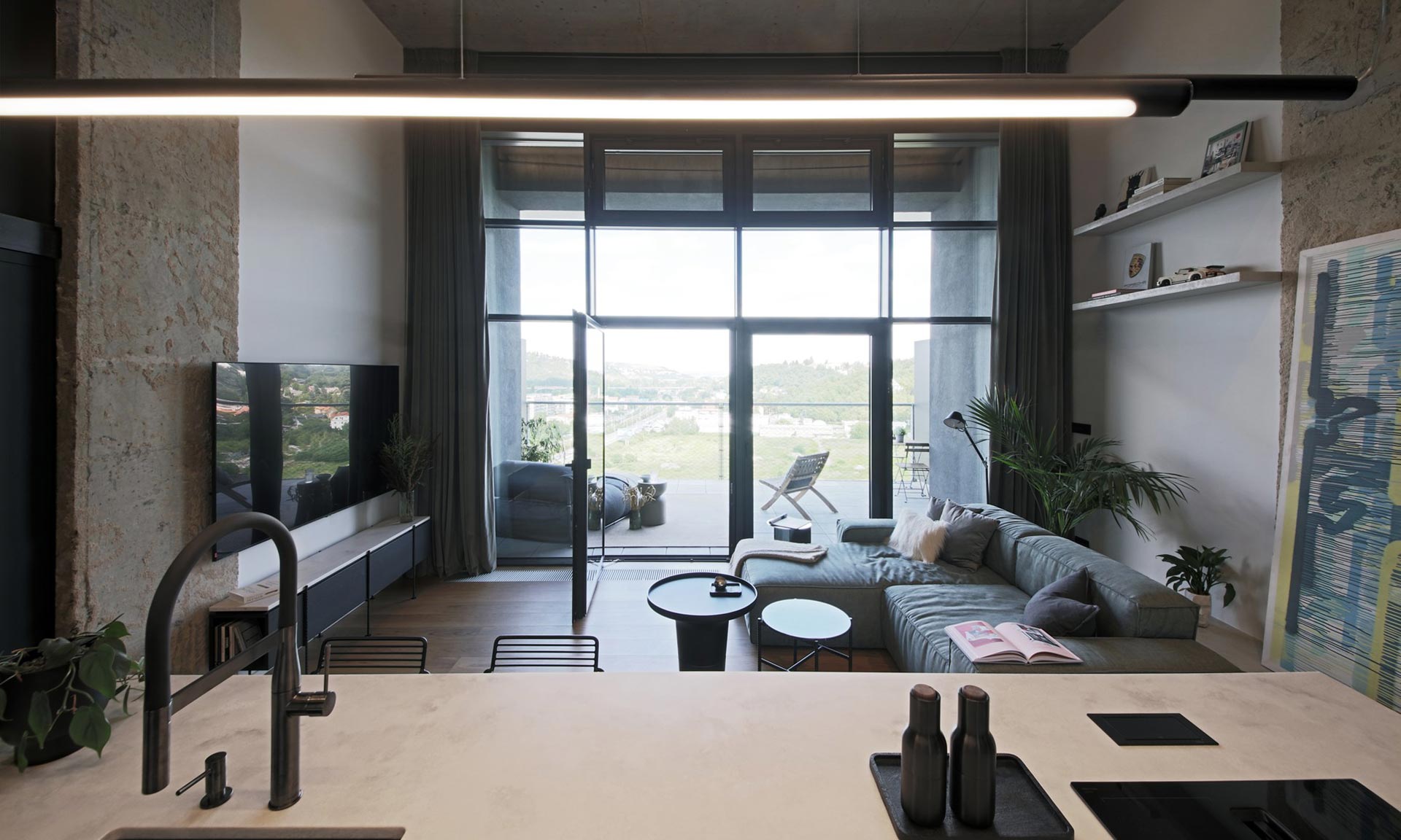 „Návrh interiéru balancuje mezi surovostí a sofistikovaností, přičemž každý detail slouží funkčnosti i estetice. Loft se nese v duchu neutrálního industriálního stylu, který tvoří základní charakter bytu. Klient, zvyklý na život v loftových bytech v zahraniční, preferoval otevřenou dispozici, která maximálně využívá prostor a výhledy. Klíčovým prvkem návrhu se proto stal výhled na Prahu – ten je promyšleně zohledněn z různých zón bytu: z pohodlí sedací soupravy, od kuchyňského ostrůvku, z postele na galerii, ale i z pokoje pro hosty. Dispozice bytu je přizpůsobena životnímu stylu mladého muže, přičemž důraz byl kladen na prostornost a funkčnost. Dominantním prvkem ložnice na galerii je volně stojící postel a na ni navazující velkorysá šatna, která je oddělena prosklenou příčkou se zrcadlovým efektem. Tento prvek umožňuje přirozenému dennímu světlu pronikat do šatny. Při rozsvícení v šatně zajišťuje průhlednost do prostoru. Pokud je naopak zhasnuto, příčka funguje jako plnohodnotné zrcadlo, čímž se opticky zvětšuje celý prostor,“ uvádí k projektu Michaela Záhorovská.