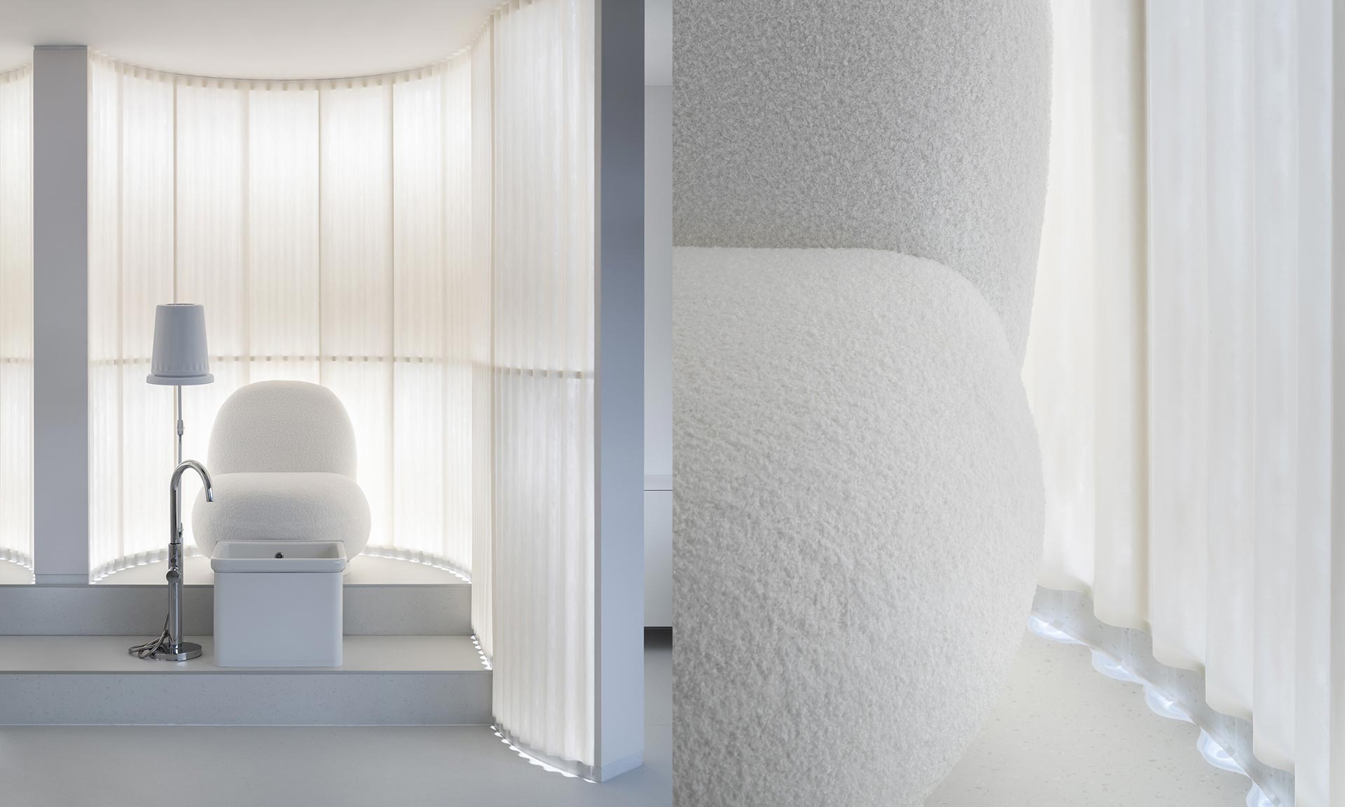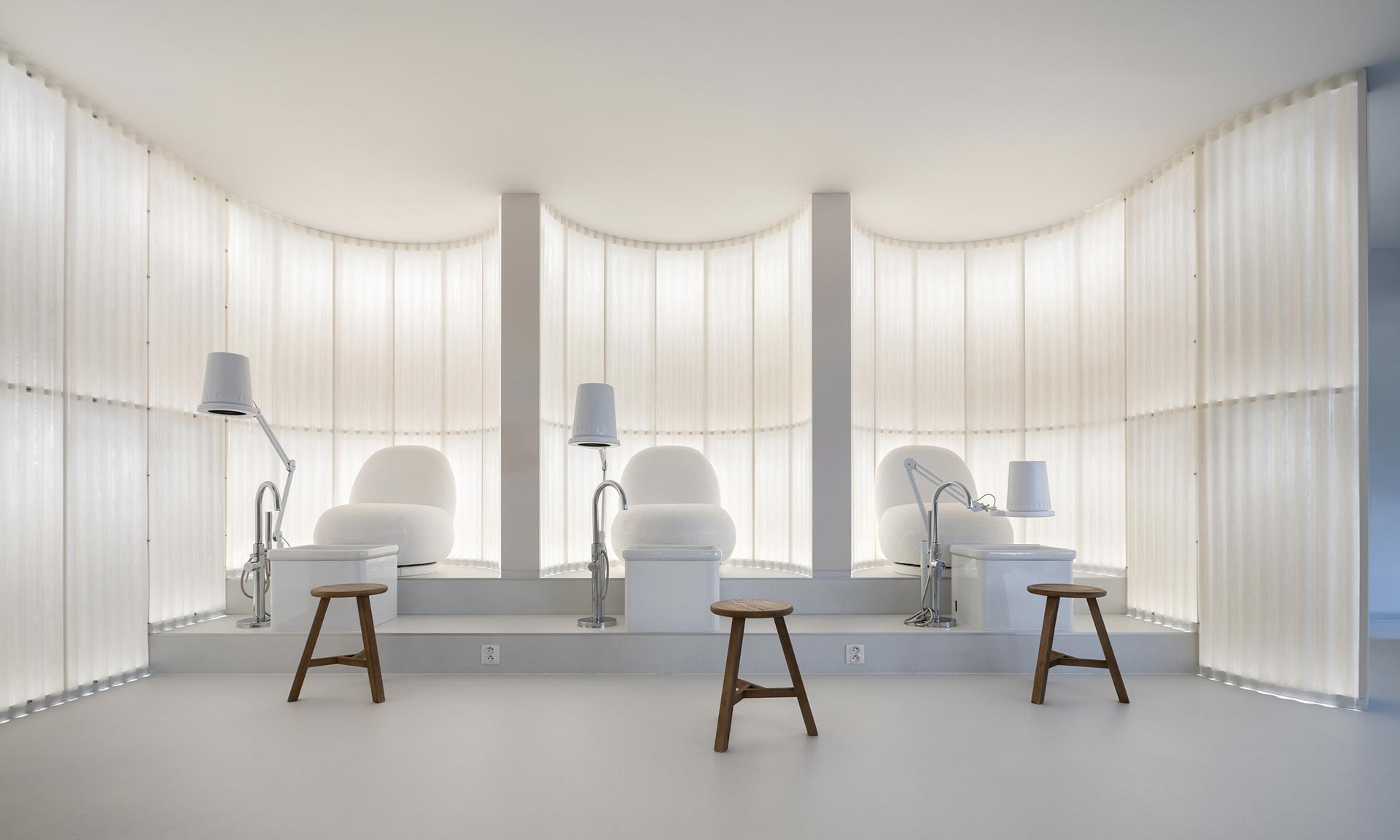 „V rámci nového developmentu na rozhraní pražských Strašnic a Žižkova jsme navrhli pobočku salonu manikúry a pedikúry. Program sám o sobě běžný, pro nás však téměř neznámý. Neprobádaná typologie se stala vítanou výzvou a základem dynamické spolupráce s klientem, který nás provedl choreografií celého provozu. V centru tohoto představení je návštěvník a jeho prožitek, který jej má ze všednosti vytrhnout. Navrhovali jsme současně dramaturgii i kulisy jednotlivých dějství — od recepce, přes dlouhý stůl pro manikúru, vyvýšené trůny stanic pedikúry, až po toalety a zázemí za oponou tvořenou oblou hmotou místnosti pro klienty vyžadující více soukromí. Všechny tvary a vrstvy jsou navrženy tak, aby každý pohyb prostorem vtahoval návštěvníka hlouběji do divadla salonu,“ uvádí architekti Lenka Vávra a Petr Vávra.