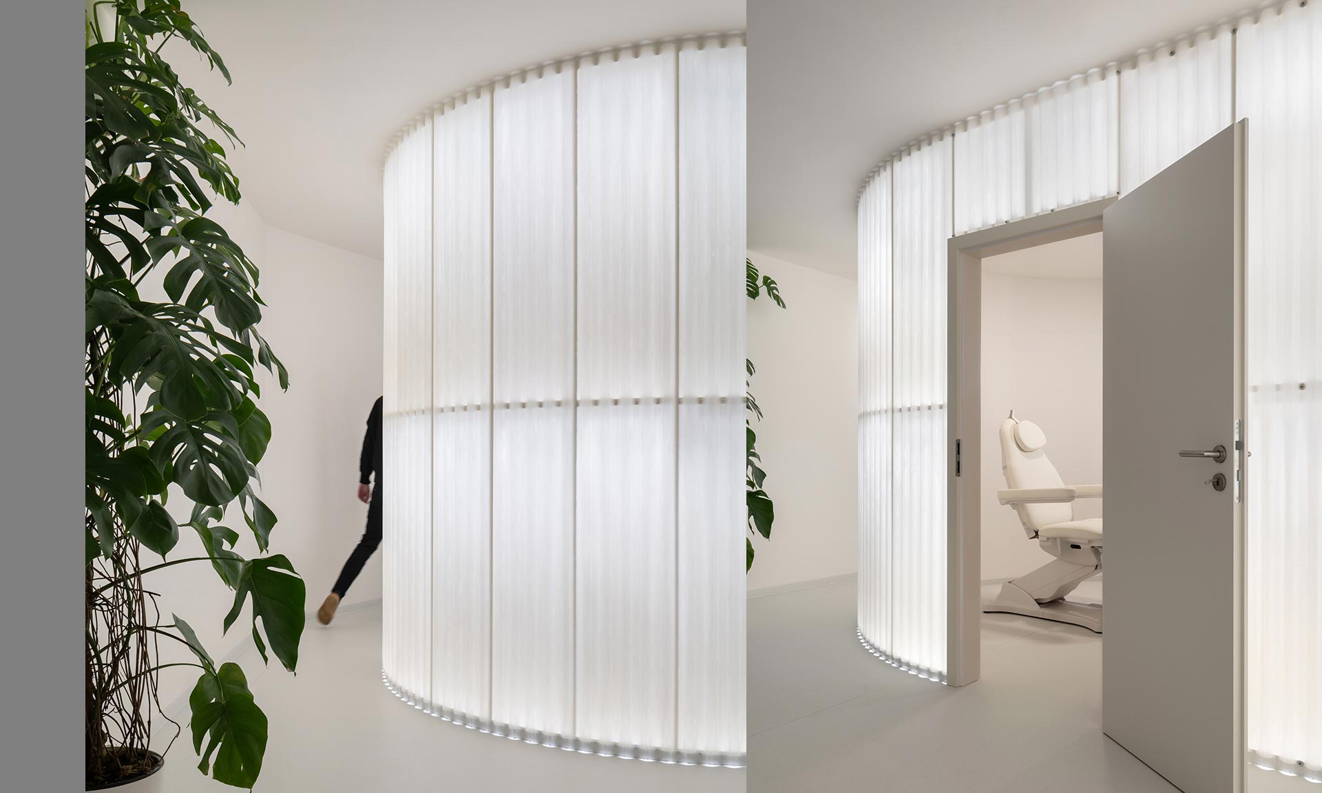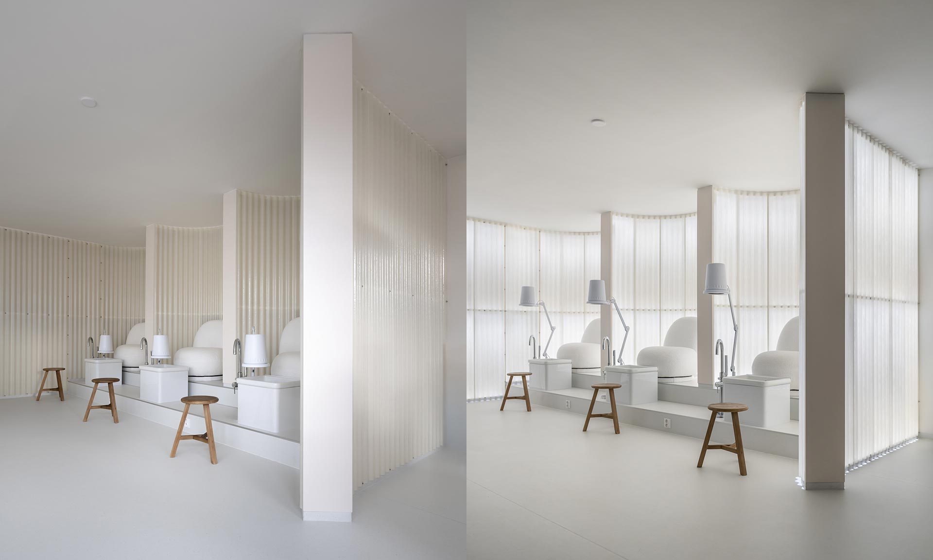 I když je interiér salonu poměrně malý, má jen 92 metrů čtverečních celkové užitné plochy, je díky výběru barev a také vyšším stromům zdánlivě prostorný. Zajímavé je využití průsvitných vlnitých polykarbonátových desek jako dělících příček, které při podsvícení dostávají efektní nádech a hezky zapadnou do interiéru. Na první pohled bylo cíleno na přívětivost, měkký a pohodlný interiér s cílem odlišit se od stovek zaměřením podobných. To se povedlo dokonale.