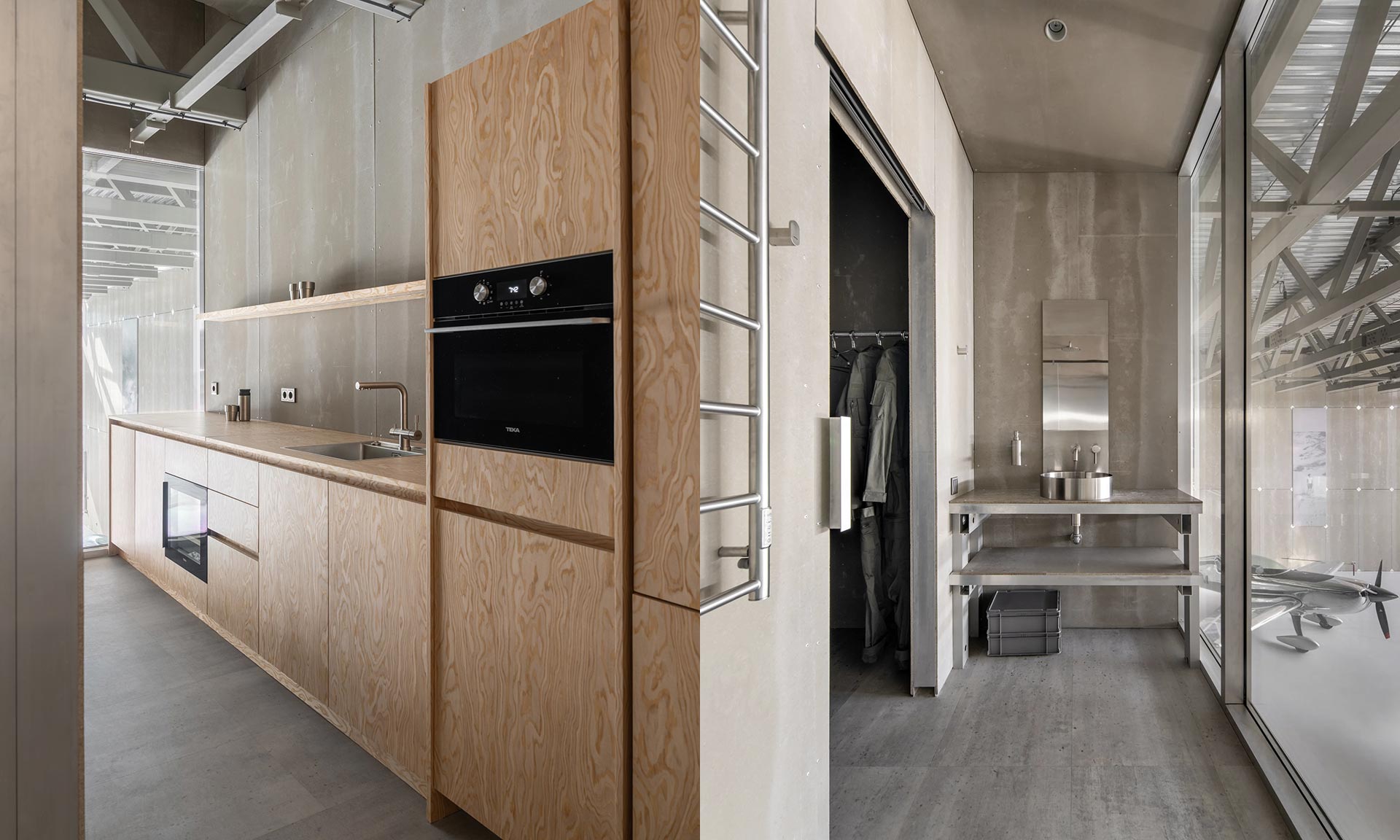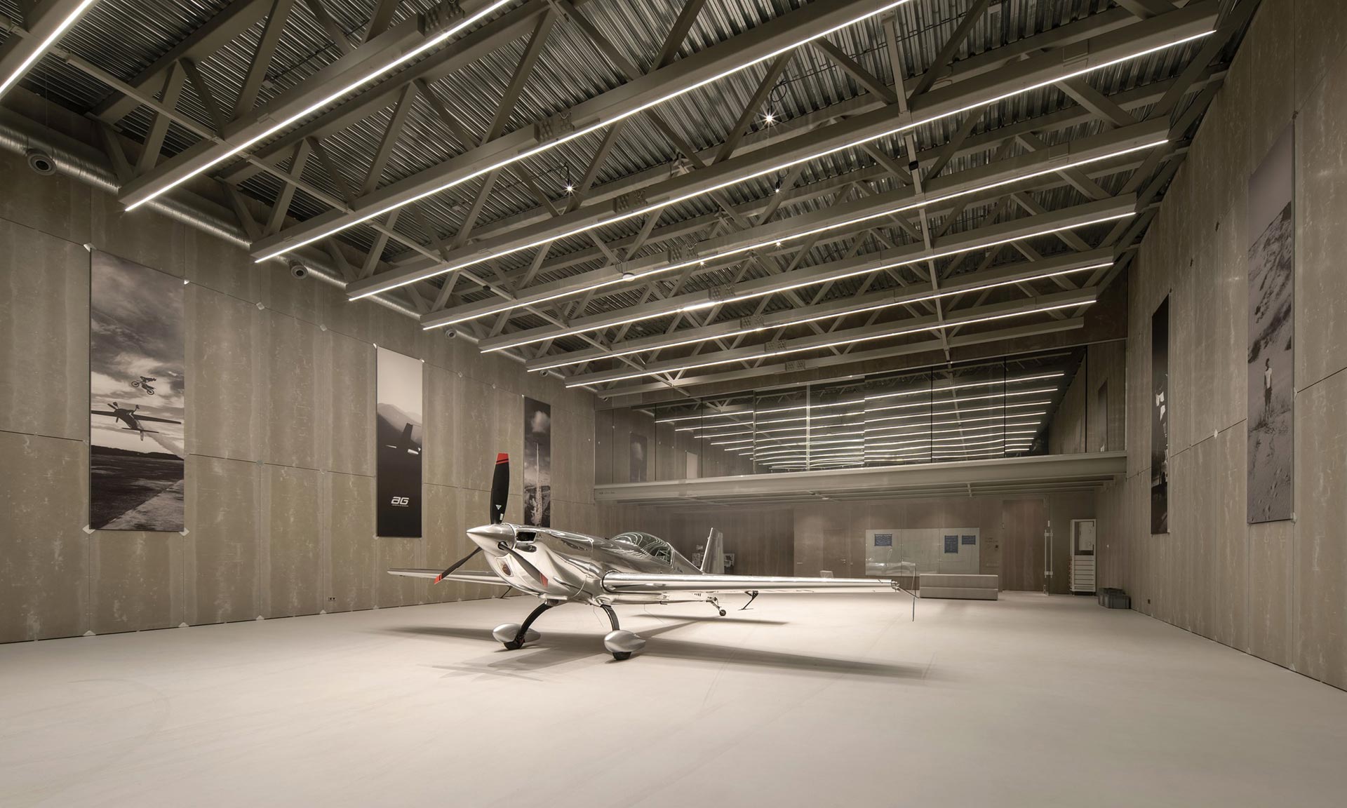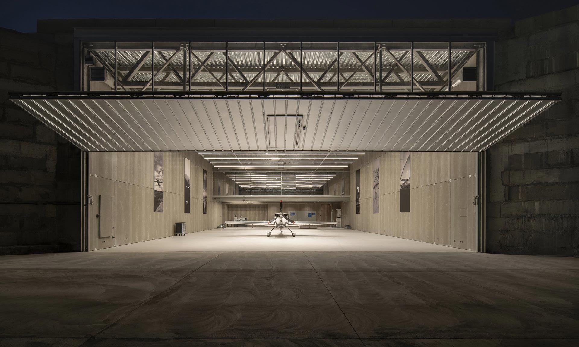 Architektonický ateliér Plus Kouple realizoval nezvyklé zadání pro interiér hangáru. Jednomu z talentovaných akrobatů a jeho týmu navrhl hangár s potřebným zázemím, kde je možné i příležitostně přespat nebo pár dní bydlet. Komplexně vybavený hangár je luxusně působící díky výběru materiálů, precizním detailům, grafickému designu a promyšlené dispozici.