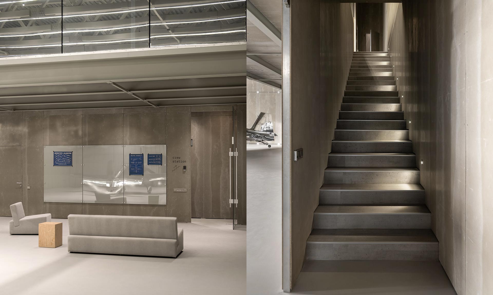 „Celkový designový jazyk zůstává záměrně umírněný a spoléhá se na odkryté povrchy, poctivé materiály a precizní detaily, aby vytvořil zralé, disciplinované prostředí vhodné pro předletové a poletové rutiny,“ dodává k designu hangáru jeho autor.