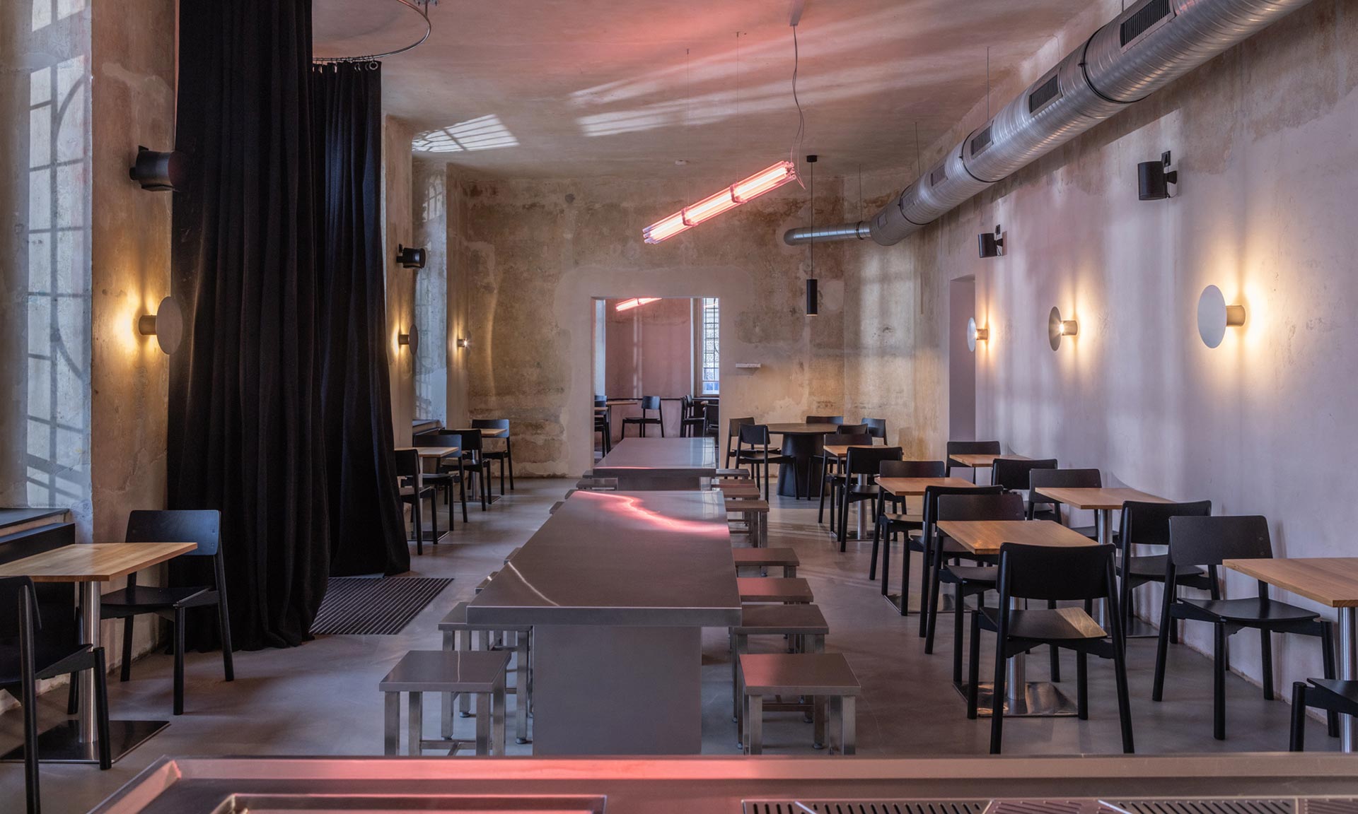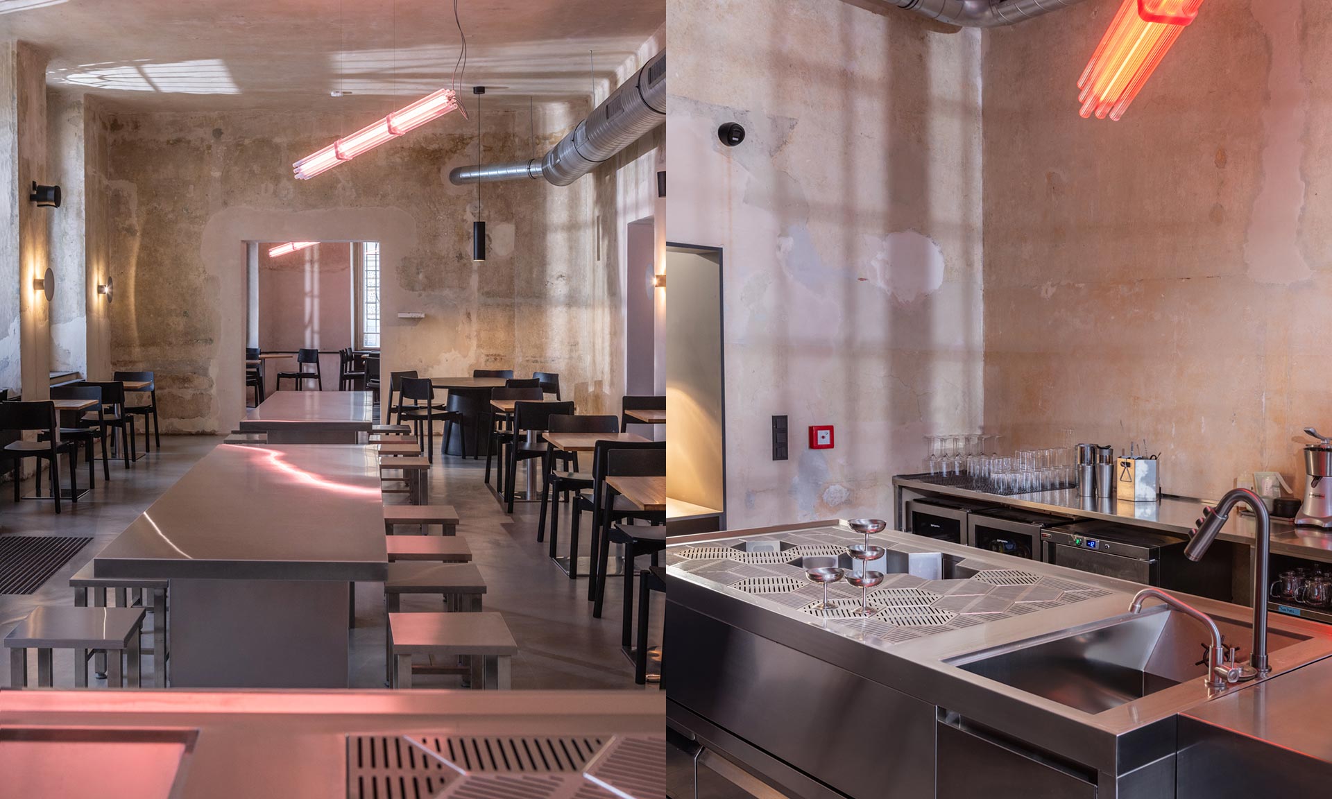 „Dominantním prvkem se stalo na míru vytvořené a vyrobené osvětlení z LED trubic, jehož proměnlivá barevnost umožňuje interiér přirozeně přizpůsobovat denní době i ročnímu období. V letních měsících se pracuje se světlými tóny, které navozují pocit svěžesti a opticky ochlazují interiér. Naopak v zimě převládají teplejší oranžové odstíny podporující pocit intimity a útulnosti. Ve večerních hodinách světlo přechází do výraznější červené, která podtrhuje noční charakter baru a zážitkového bistra, nebo se barevnou škálou přizpůsobuje tematickým večírkům,“ dodávají s tím, že jsou i autory třímetrových nerezových stolů, které stojí uprostřed prostoru.