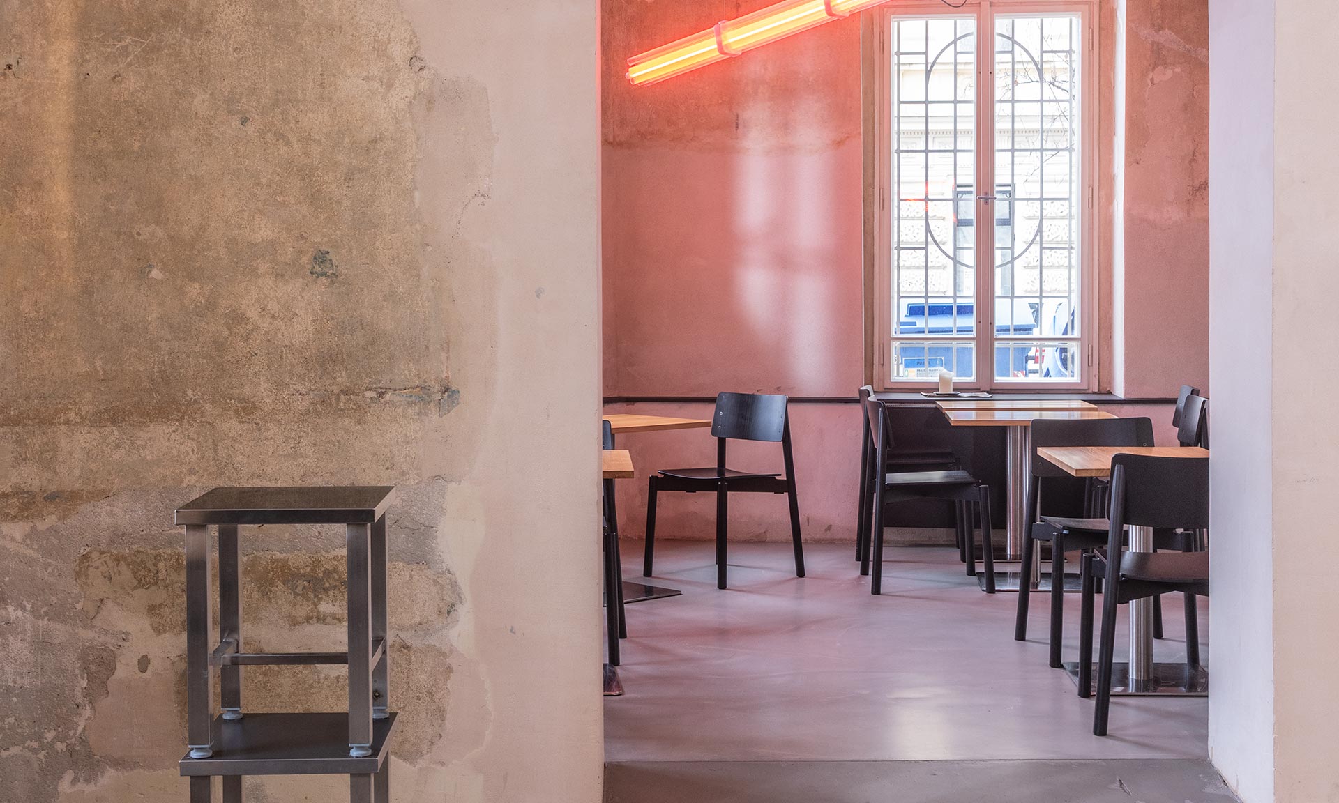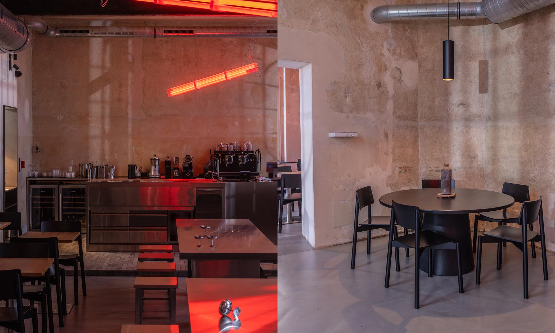 „Dispozičně je kavárna rozdělena na velkorysou vstupní část s barem, která je prosvětlená skrze okna s výhledem na sousední kostel Nejsvětějšího srdce Páně, rohovou část vhodnou pro oddělenou společnost, a technické i gastro zázemí. Architektonické zásahy reagují jak na praktické potřeby provozu, tak na kontext místa. Schůdek pod nerezovým barem vychází z proporcí obkladu sousedního kostela od architekta Jože Plečnika a vytváří jemnou vazbu na lokální architektonické dědictví. Barevné odlesky na jejich povrchu posilují celkový charakter interiéru jako umělecké instalace,“ uvádí designéři.