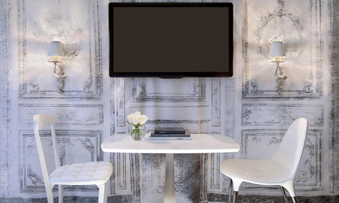 V interiéru 132 hotelových pokojů si také vyhrál s tématem francouzské aristokracie. Zařídil je velkými bílými gauči, bílou dřevěnou podlahou, na zdi pověsil gobelíny se starobylým potiskem a pokoj osvětlil svým typickým výrazným lustrem. Bílou barvu doplnil světle růžovými akcenty v doplňcích a skleněných stěnách sprchového koutu, ale také třeba na lehátkách a slunečnících na hotelové pláži.