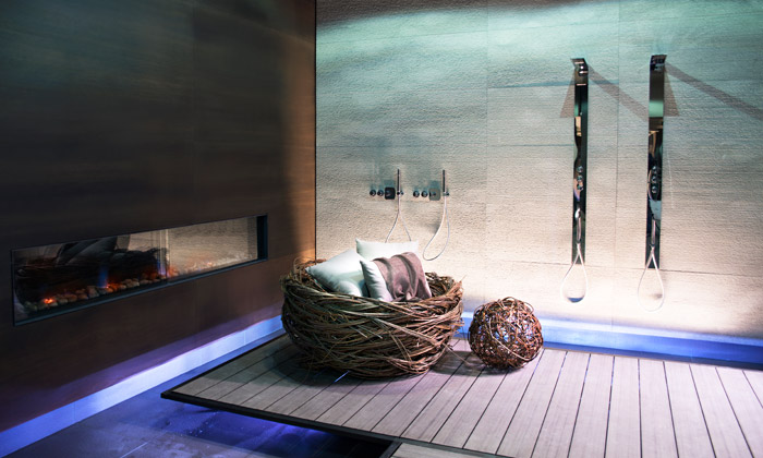 Gessi pojalo předvedení svých novinek jako výstavu s názvem Koupelny světa. Nejintimnější místnost domu, kterou je podle nich koupelna, byla vždy vybavena do nejmenšího detailu od podlah a dekorace stěn přes sanitární vybavení až po dekorace a textilie. Nám asi nejbližší koupelna ve středomořském stylu využívá mořské zdobnosti, kamene, stolu s kovovými dekoracemi i klec s létajícími motýli. Japonská koupelna je postavena na minimalismu, dřevě a na zemi ležících textiliích.