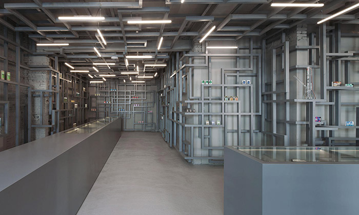 Obklady stěn a stropu obchodu tvoří nepravidelně rozvětvená mříž z dřevěných šedých hranolů. Lineární LED osvětlení zavěšené u stropu dodává interiéru jasné světlo a hranoly na stěnách jsou využity i jako police pro vystavení výrobků. Dva šedé pulty s prosklenými vitrínami, ve kterých je vystaveno některé dražší zboží, jsou umístěny v obchodě odděleně a kolmo na sebe. Architekt “svlékl” interiér při renovaci až na holé zdi a záměrně zanechal i některé prvky stavebních prací, například viditelné cihly na stěnách za mřížkou.