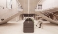 Nejdůležitější bylo vnést do interiéru maximum denního světla, což byl problém, protože dům měl okna pouze v pásu pod střechou a přízemí prostoru by zůstalo temné. Architekti proto navrhli ponechat celý prostor otevřený. Dominantou interiéru je tak velké rozvětvující se schodiště do prvního podlaží vestavěného z betonových ramp. V přízemí najdeme obývací část, pod schody kuchyňský ostrůvek a jídelní kout. Samozřejmě zde nechybí přidaná francouzská okna.