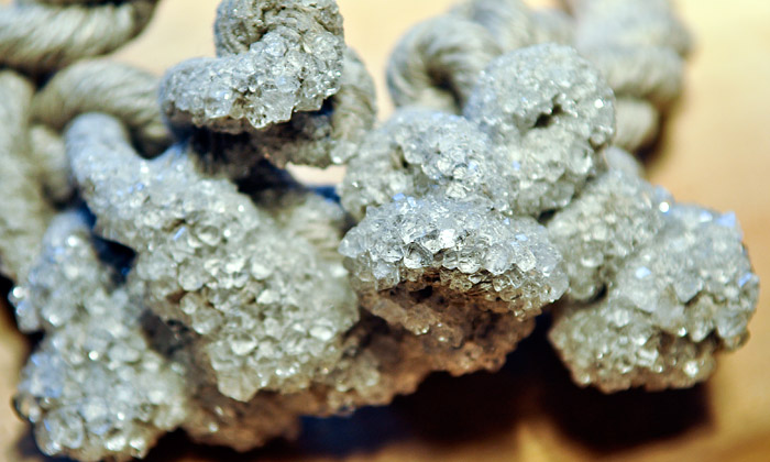 „Studovali jsme chemické a biologické procesy, při kterých jsou různé objekty napadány cizorodými látkami. Kolekce je pomyslně rozdělena na dvě části. První tvoří prostorové studie šperků ze lněných lan porostlých křehkými kamencovými krystaly. Ve druhé části jsou tyto objekty transformovány do řetězů ze zlata a nerezu ve spojení se surovými diamanty, barokními perlami a pyrity,“ popisuje novou kolekci Daniel Pošta.