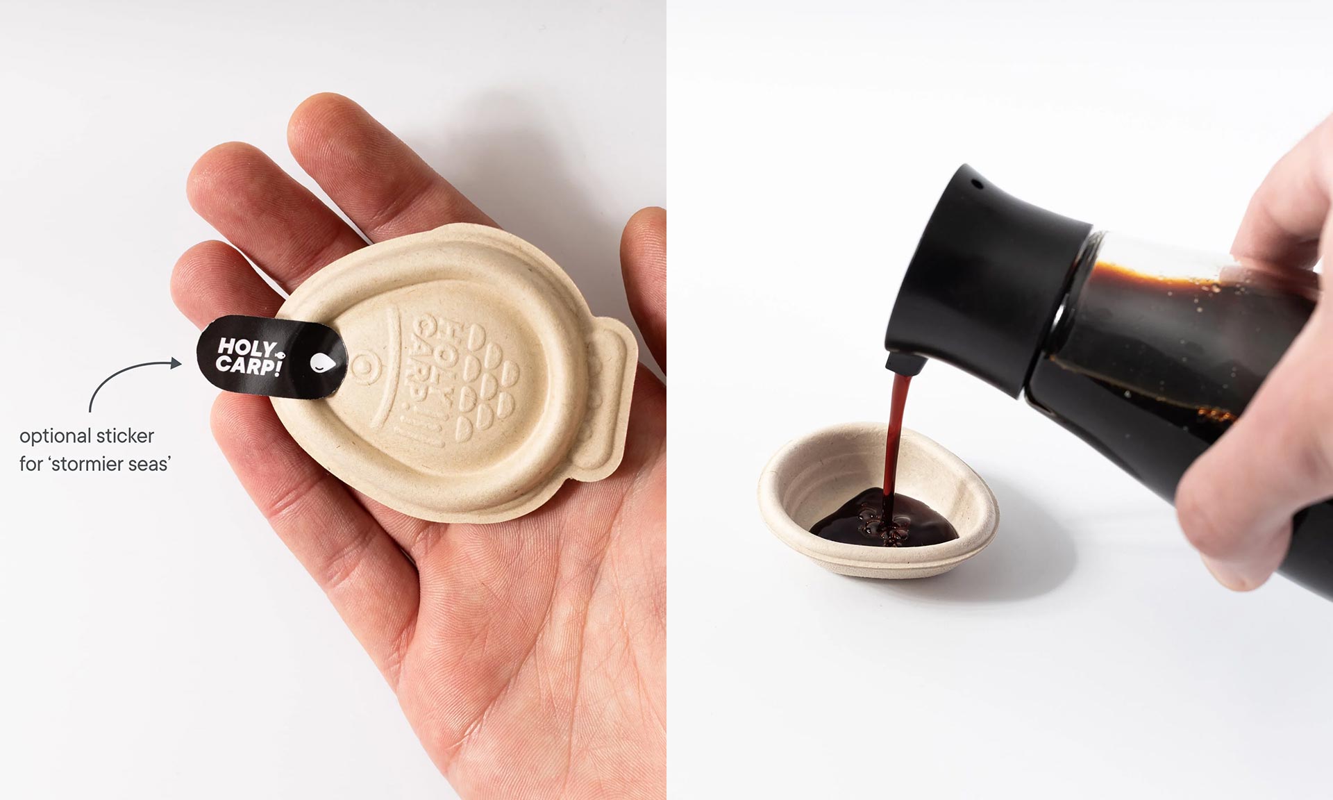 „Tyto malé ryby se používají jen na pár vteřin, ale vydrží stovky let, škodí životnímu prostředí a potenciálně přidávají mikroplasty do našich potravin. Je čas se jich zbavit. Vytvořili jsme kompostovatelnou kapátko na omáčky, které je mnohem lepší. Na rozdíl od jednorázových plastů, které se rozkládají věčně, je Holy Carp vyroben z obnovitelné rostlinné buničiny, která se snadno rozkládá a nezanechává po sobě nic jiného než živiny pro půdu. Vložte do kompostu a Holy Carp zmizí během několika týdnů,“ uvádí australská značka.