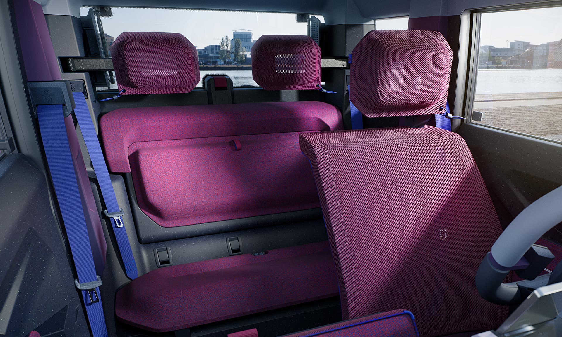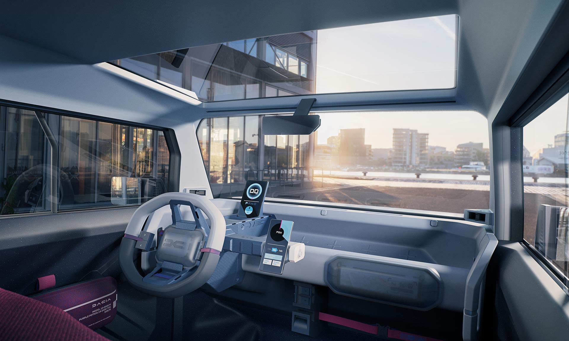 „Interiér konceptu Dacia Hipster byl optimalizován tak, aby nabídl výjimečný prostor vzhledem k jeho kompaktním vnějším rozměrům. Interiér úzce kopíruje velmi kubické tvary karoserie, zejména díky velmi svislým oknům a čelnímu sklu, aby se maximálně využil dostupný prostor. Prosklená přední část střechy zajišťuje světlo a přispívá k pocitu prostornosti. Aby se snížily náklady a hmotnost, jsou boční okna posuvná. V Dacii Hipster Concept se pohodlně usadí čtyři dospělí. Poloha sedadel řidiče a spolujezdce je identická s modelem Dacia Sandero, což zajišťuje pohodlí a bezpečný výhled na silnici. Přístup na zadní sedadla usnadňuje široké otevírání dveří a sklopné přední sedadlo spolujezdce. Dacia věnovala zvláštní pozornost designu sedadel, aby spojila pohodlí a uživatelský komfort se snížením hmotnosti a nákladů. Jejich design byl zjednodušen pomocí viditelného rámu v kombinaci s obzvláště příjemnou technickou síťovinou. Přední sedadla jsou spojena do lavice, což je jednoduchý a příjemný prvek, který je dalším odkazem na ikonické populární vozy minulosti. A konečně, prolamované opěrky hlavy opět pomáhají optimalizovat hmotnost. Dacia Hipster Concept je navržena pro reálný život a hodí se do všech každodenních situací. Díky sklopnému zadnímu sedadlu se objem zavazadlového prostoru může pohybovat od 70 litrů se čtyřmi cestujícími až po 500 litrů se dvěma cestujícími,“ dodávají k interiéru vozu, který má omezenou rychlost na 90 kilometrů za hodinu.