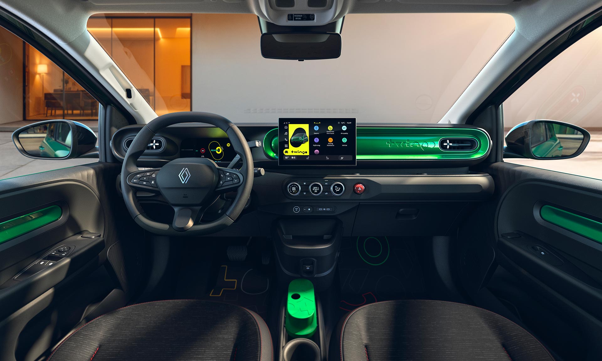 „Interiér elektrického vozu Twingo E-Tech také vyjadřuje veselou atmosféru a optimismus, které tento vůz vyzařuje. Tento dojem je okamžitě patrný z válcového designu barevné palubní desky, která jako by visela ve vzduchu a vytvářela pocit otevřenosti. Uprostřed palubní desky získal ikonický červený tlačítko pro výstražná světla průhledný kryt, který mu dodává modernější vzhled. Interiér obsahuje i další odkazy na ducha modelu Twingo. Původní slogan Twingo A vous d’inventer la vie qui va avec (je na vás, abyste si vymysleli život, který k němu patří) je vidět na popruzích sloužících k posouvání zadních sedadel, přístupných z kufru, stejně jako na popruzích sloužících ke sklápění zadních sedadel z prostoru pro cestující. Zpráva Ouvert d’esprit (otevřená mysl) je viditelná na vnitřní straně zadních dveří,“ dodává s tím, že česká cena ještě nebyla zveřejněna.