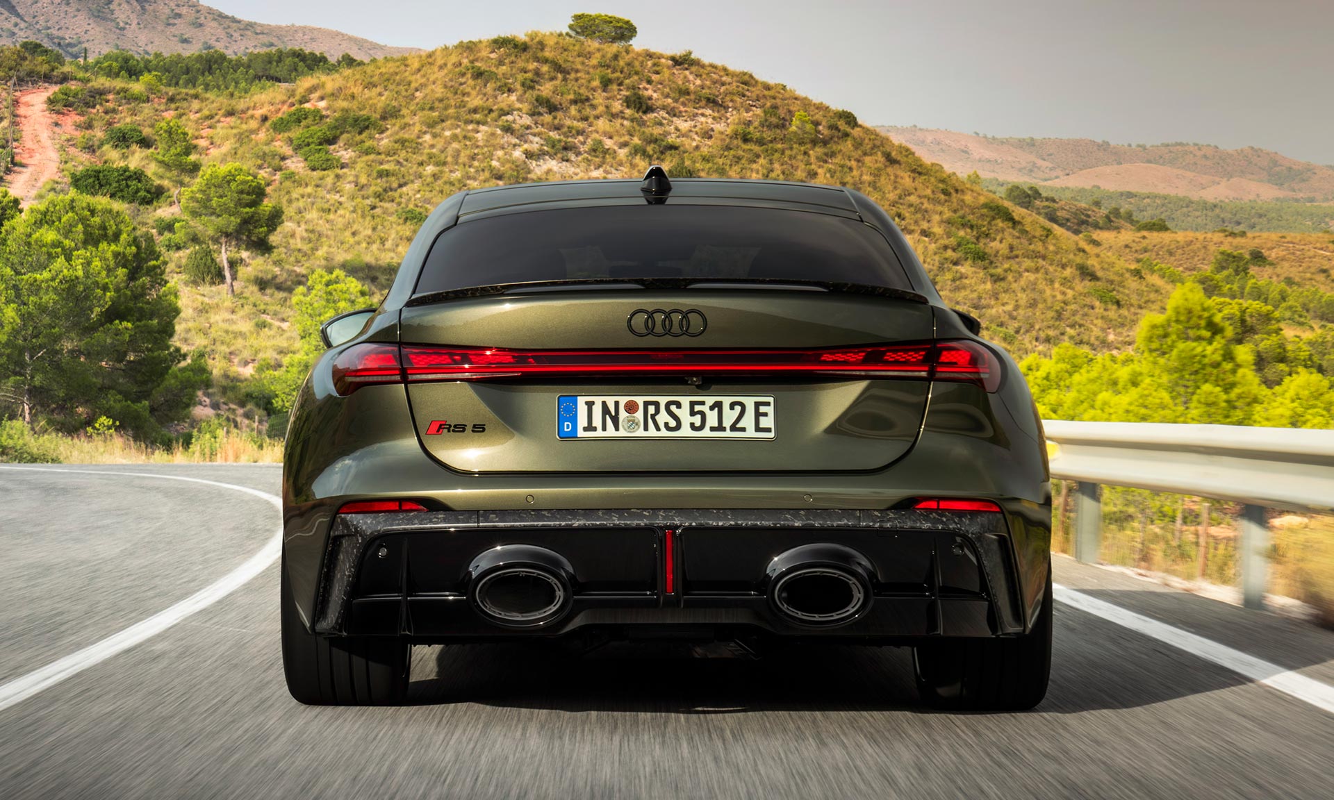 „Stejně jako jeho slavní předchůdci se i nový model RS 5 vyznačuje typicky svalnatou konstrukcí RS. Ve srovnání se základním modelem A5 byl rozšířen o čtyři centimetry na obou stranách vpředu i vzadu. Přední část dominuje maska Singleframe s trojrozměrnou mřížkou ve tvaru voštiny. Tmavá maska jej spojuje s Air Curtains, které řídí proudění vzduchu kolem předních kol, a podtrhuje tak funkční aspekty designu. Větrací otvory před a za blatníky podtrhují silnou přítomnost modelu. Silně tvarované výřezy kol záměrně vyčnívají z linie ramen – jasná pocta legendárnímu Audi Ur-quattro a nezaměnitelný rys DNA RS,“ uvádí automobilka k modernizovanému modelu s výrazně tvarovaným zadním difuzorem.
