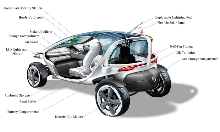 „Byl jsem nadšen nápadem navrhnout golfový vozík tak, aby získal nový tvar a nový význam. Proč bychom nemohli na golfový vozík nahlížet jako na auto a proměnit ho v golfový vůz,“ říká Gorden Wagener, viceprezident pro design společnosti Daimler AG a předseda poroty. Kromě designových řešení, která do soutěže zaslali účastníci a jejichž nejčastější nápady našly své místo v designu výsledné studie, byla při návrhu vozíku zohledněna designérská strategie značky a prvky, známé z osobních vozidel Mercedes-Benz. Patří sem zejména rozměrné čelní sklo, jejž lze elektricky ztmavit, a diamantová maska chladiče, která dominuje přídi s pozoruhodnými výběžky, v nichž jsou zakomponována diodová světla. Druhou stranu pokrývá zpětné zrcátko.